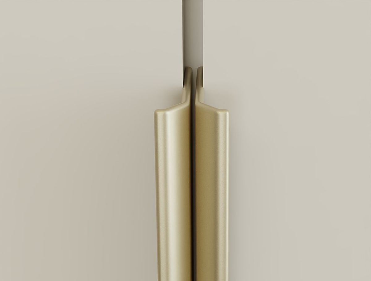 Minimalistická přední část + dekorativní úchyty v barvě kartáčovaného zlata – elegance bez přehánění.