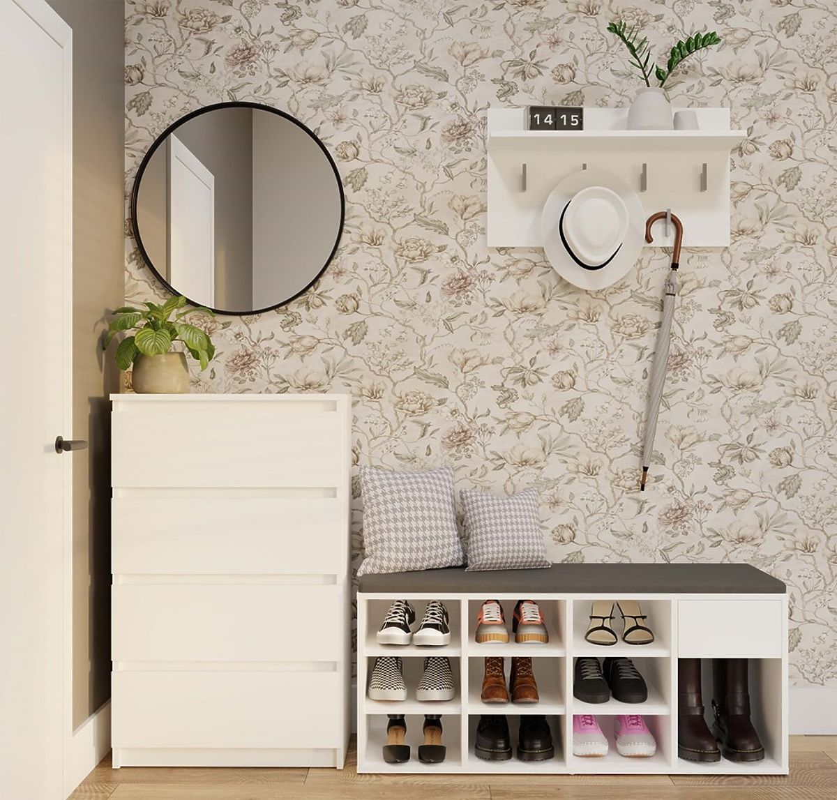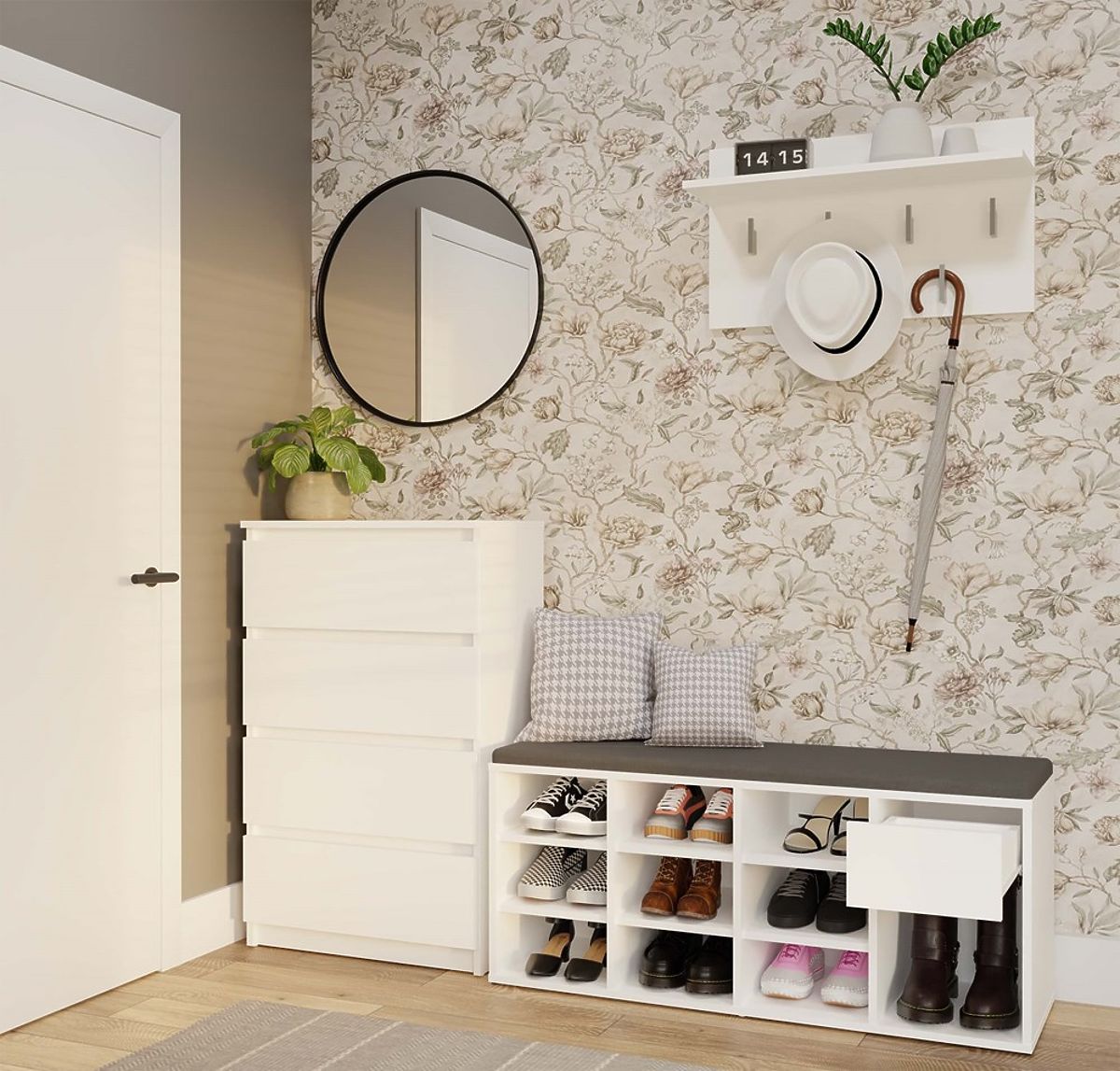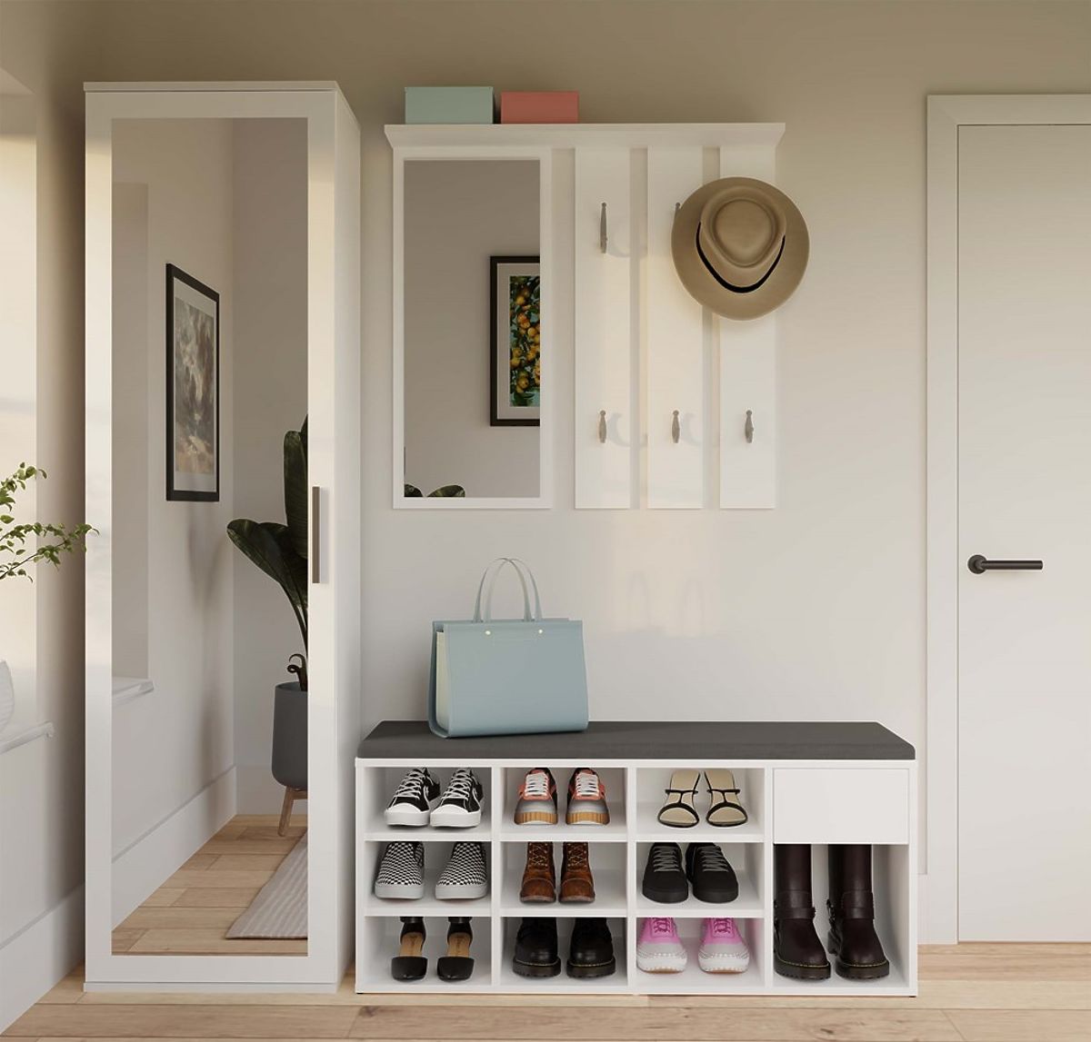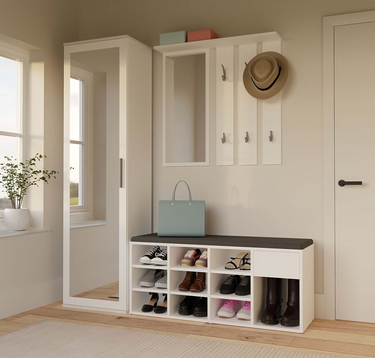 Botníková skříň TALLIN s čalouněným sedátkem a 9 přihrádkami. .. více