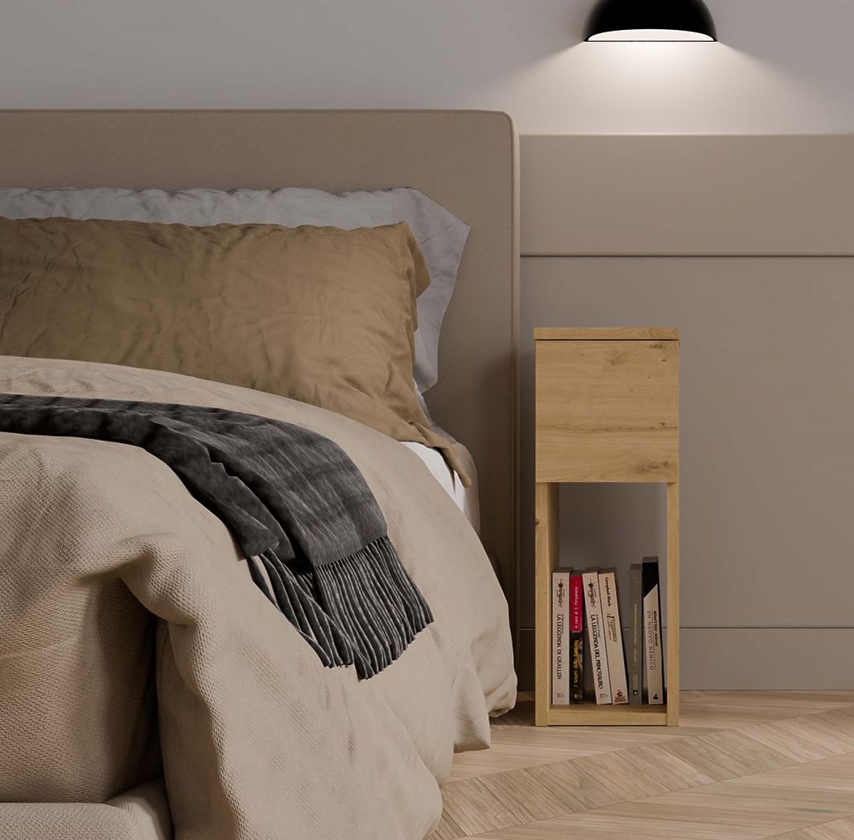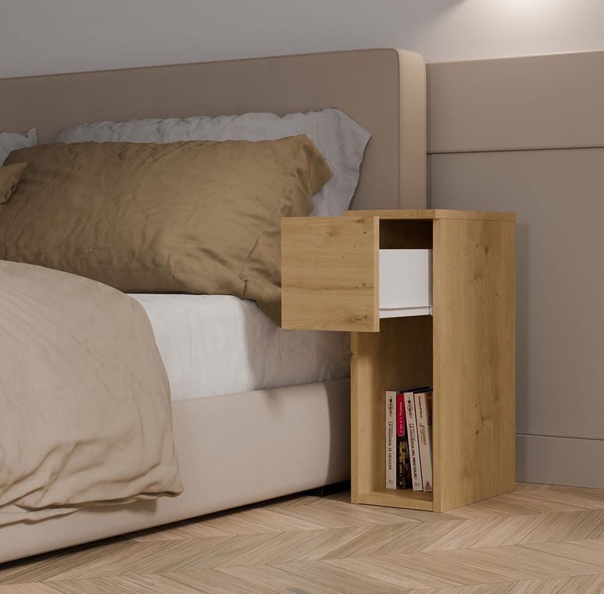 - Zásuvka a otevřená police - ideální pro uložení nejpotřebnějších věcí, jako je telefon, nabíječka, kniha nebo brýle.