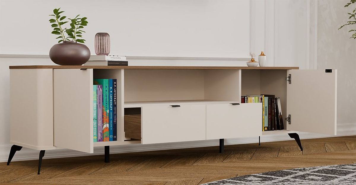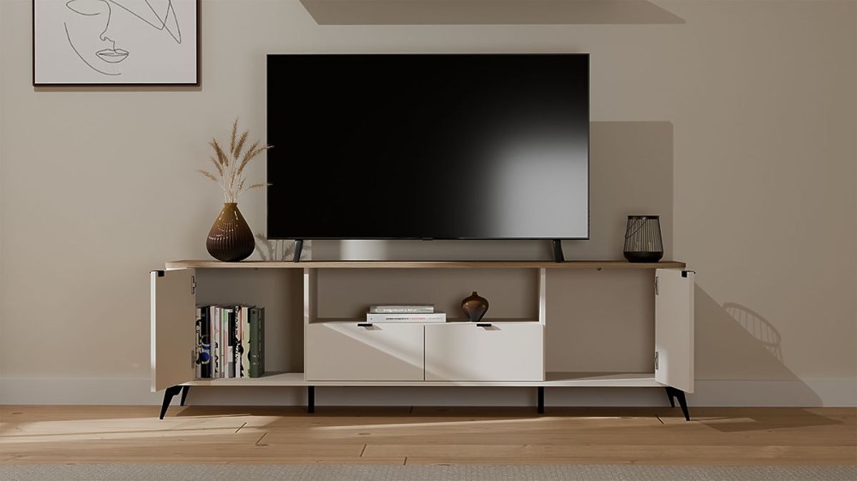 TV skříňka CORDOBA 2D2S je moderní návrh z výjimečné kolekce Cordoba - spojující eleganci béžové barvy Kašmír s teplem přírodní desky v dekoru Dub Castello. Minimalistická forma, zaoblené boky a výrazné detaily činí tento nábytek nejen funkčním, ale také estetickým prvkem každého obývacího pokoje.