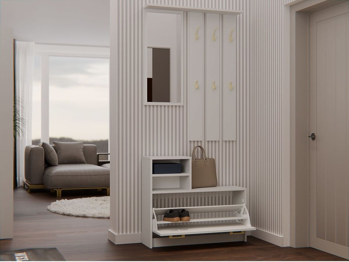 Praktická šatní skříň s věšáky a zrcadlem v barvě kašmíru. .. více