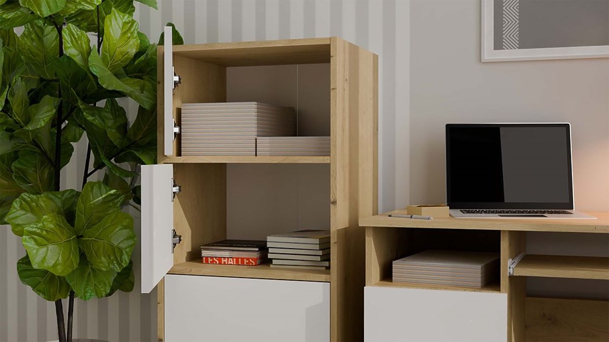 Díky prostorným policím skrytým za hladkými dveřmi, komoda poskytuje spoustu úložného prostoru a usnadňuje udržování pořádku v každém prostoru.