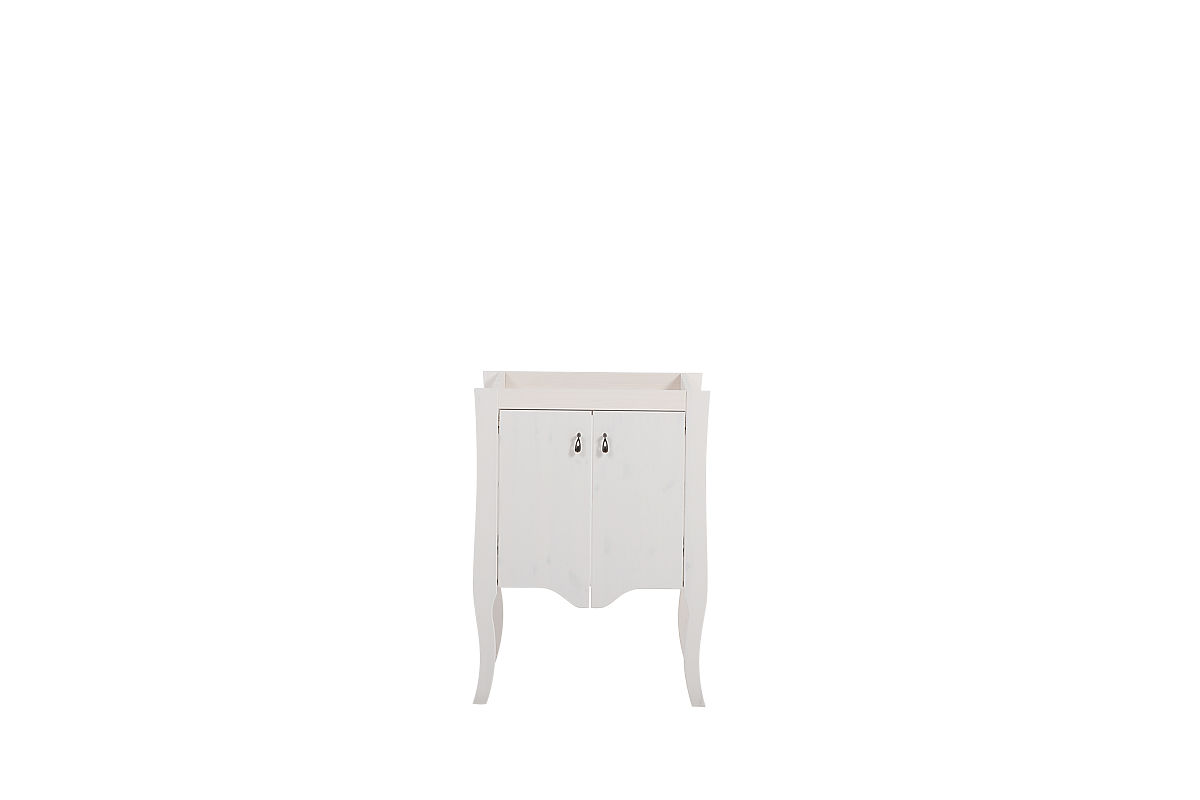 Skříňka pod umyvadlo z borovicového dřeva s bílými čely a chromovými úchyty. .. více
