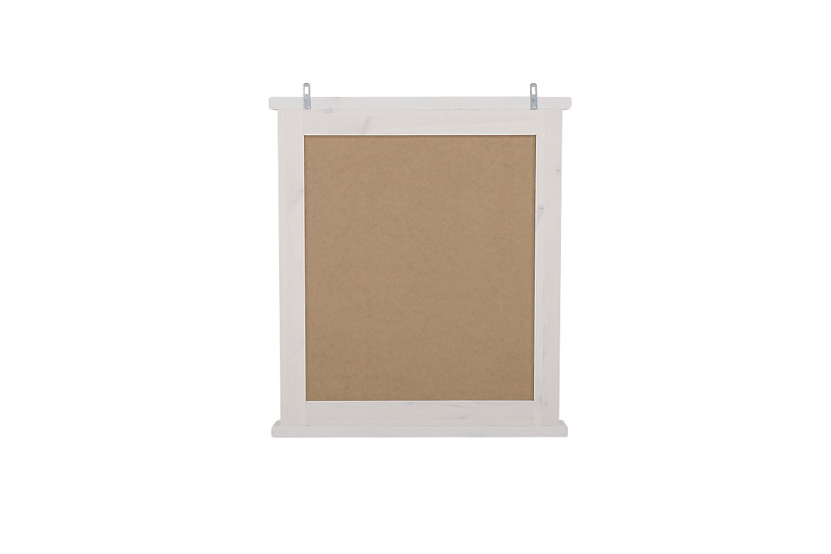 Obdélníkové zrcadlo s bílým rámem a policí. .. více