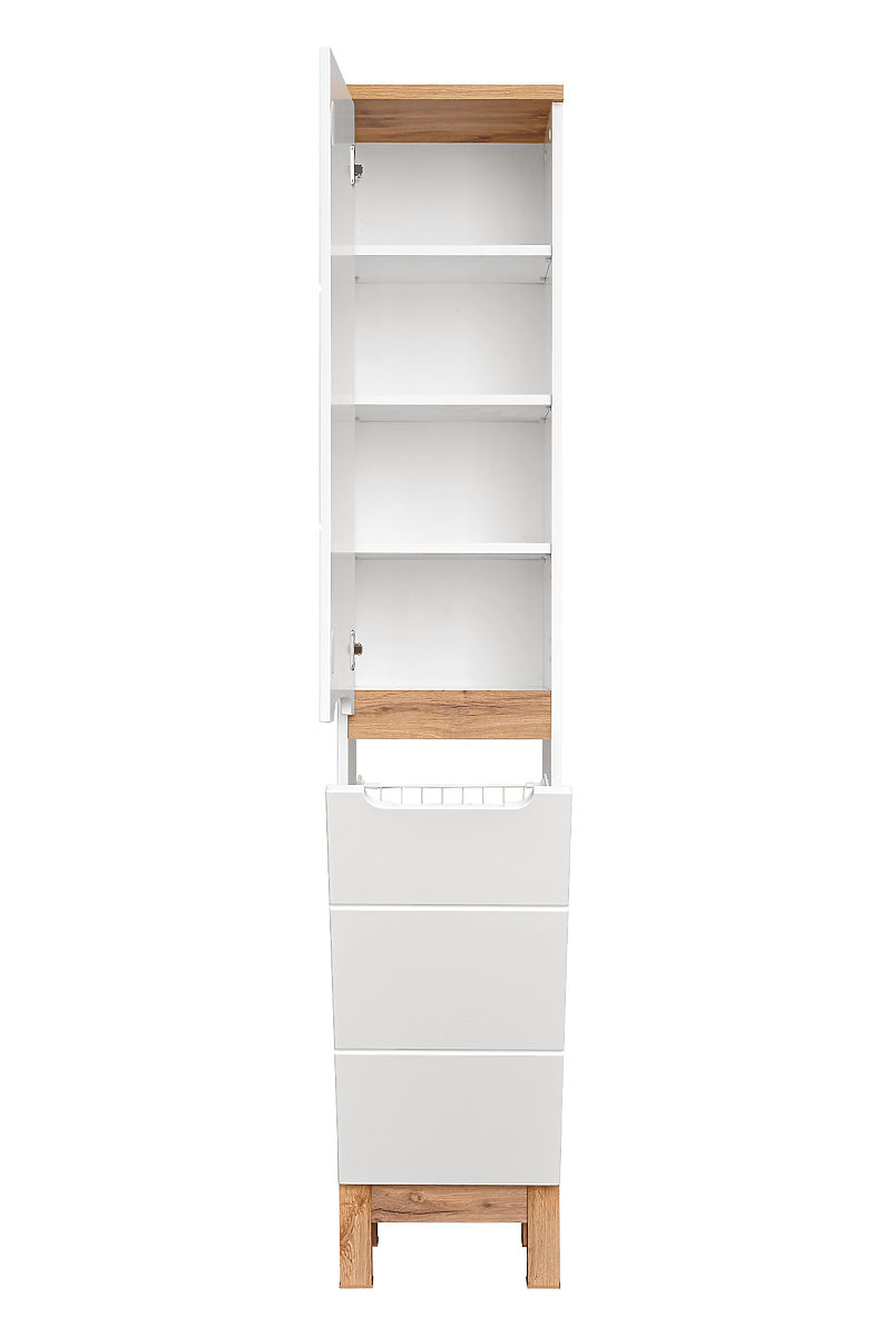 Vysoká skříň s bílým lesklým povrchem a tichým zavíráním. .. více