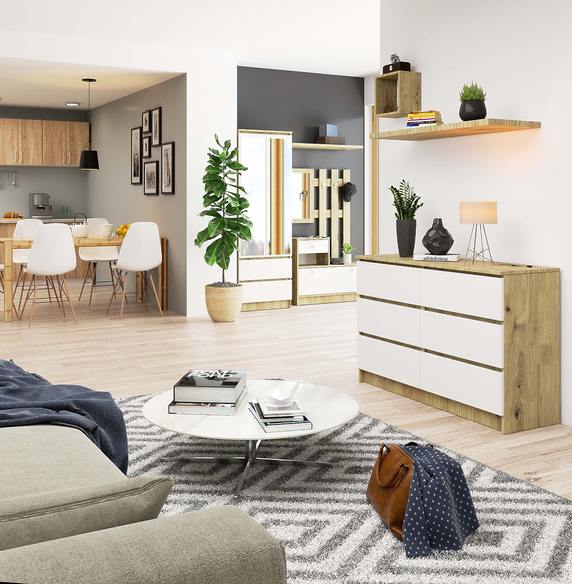 Komoda s šesti zásuvkami v kombinaci dubu a bílé. .. více