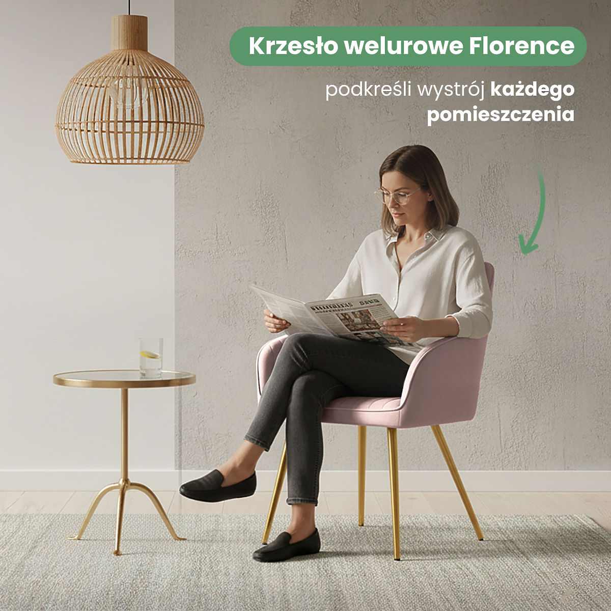 Sametová židle FLORENCE se vyznačuje elegantním čalouněním s vertikálním prošíváním, které jí dodává jemný půvab a styl. V závislosti na barevné variantě mohou být nohy židle černé nebo zlaté, což jí dodává ještě výjimečnější vzhled. Sametová židle Florence podtrhne výzdobu každé moderní jídelny a promění skromné uspořádání v zajímavý a stylový interiér. Tento model se nejlépe hodí k výzdobě v moderním, soft modern nebo glamour stylu.