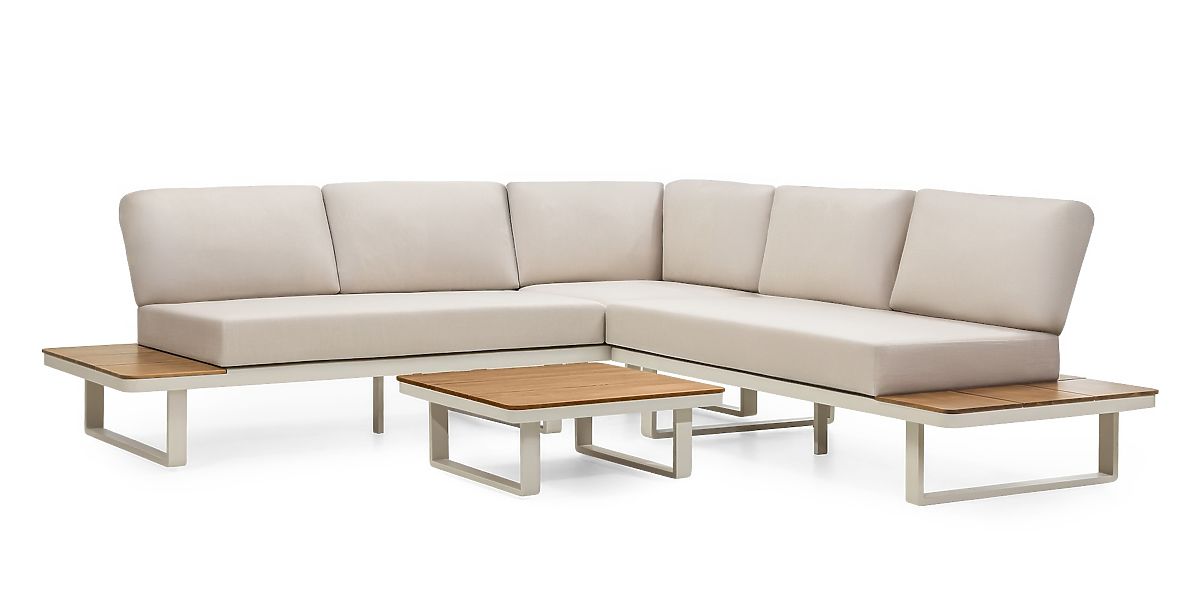 Zahradní rohová sedačka se stolkem Porticato, akáciové dřevo FSC, teakový vzhled, světle béžová