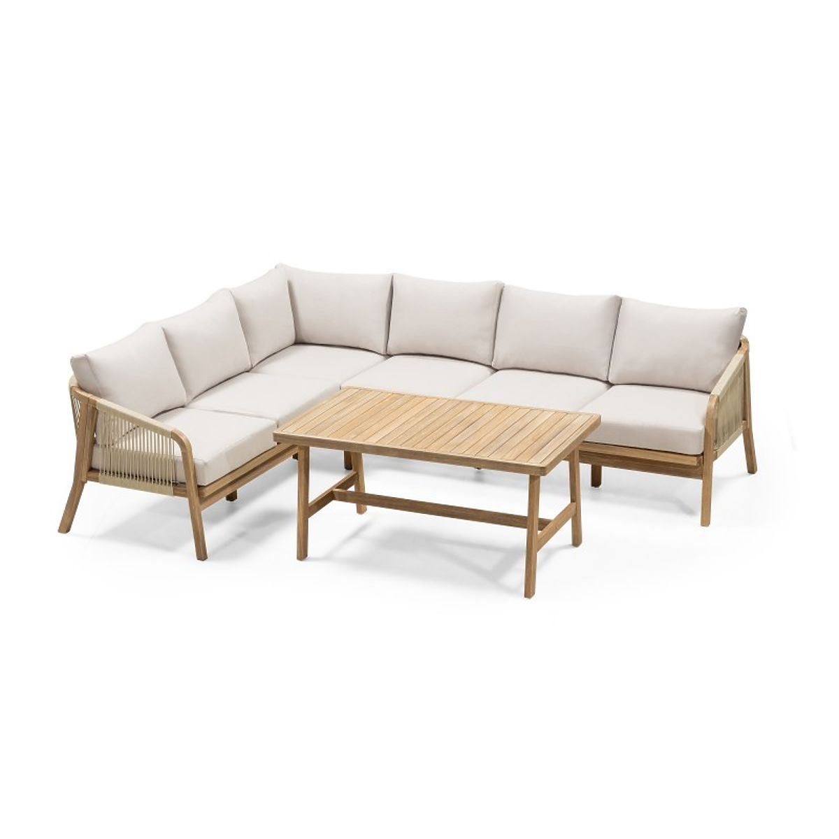 Zahradní rohová souprava Castello s teakovým vzhledem a béžovými polštáři. .. více