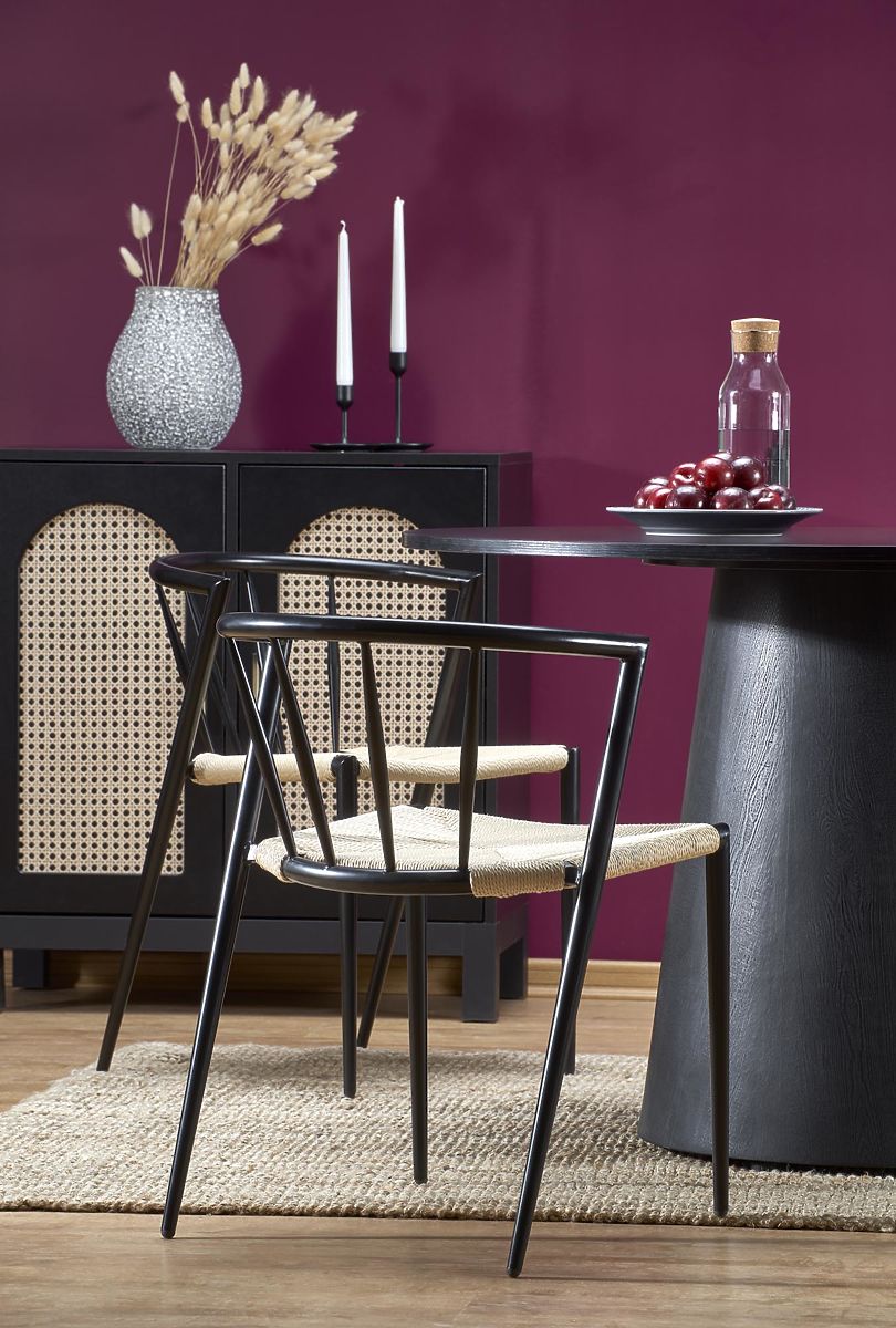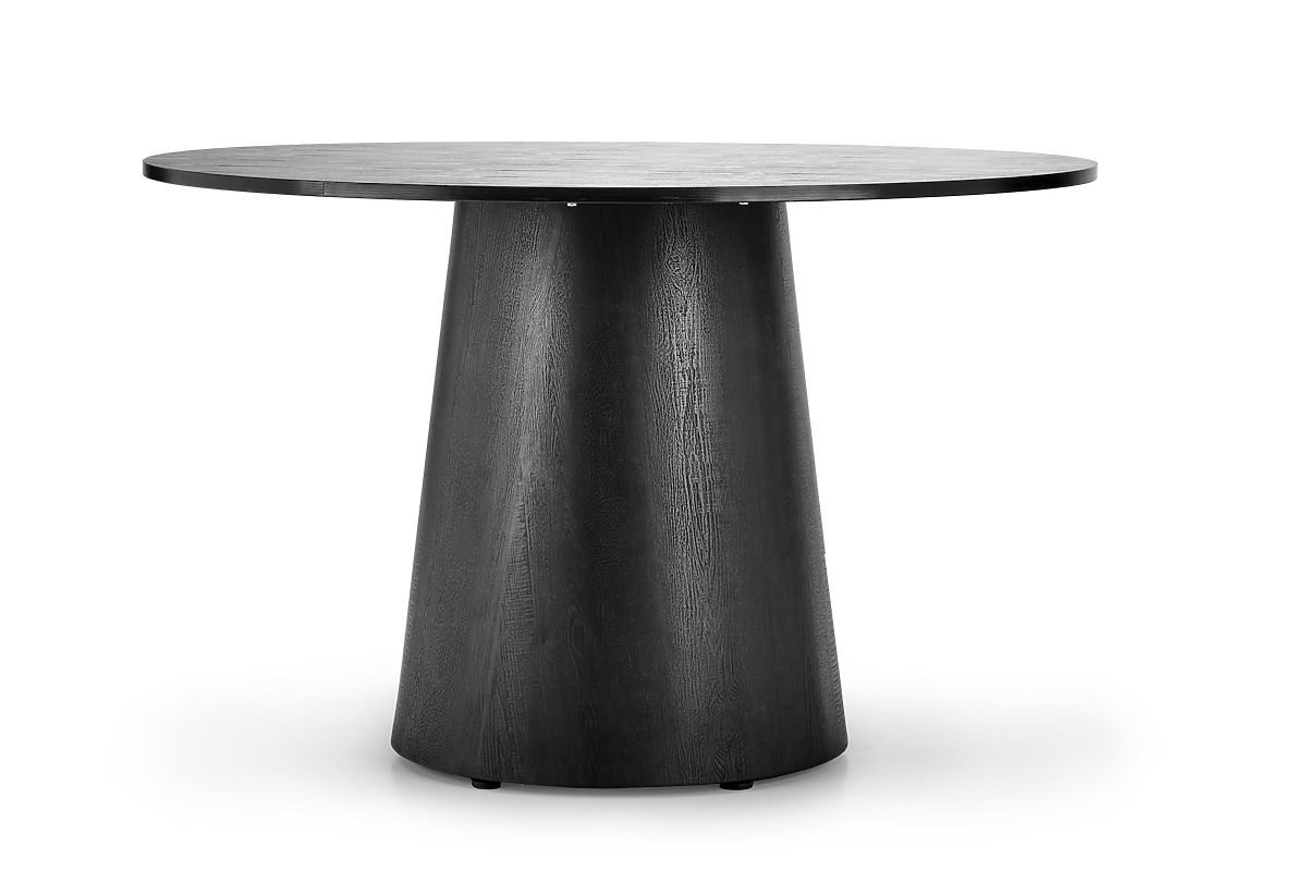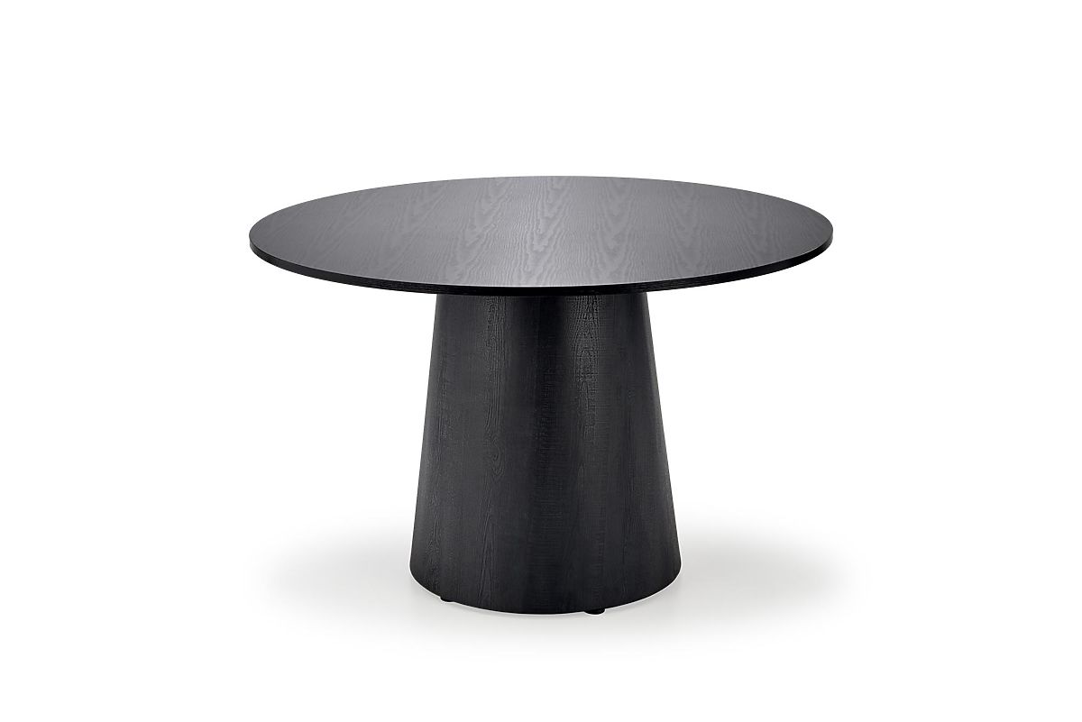 Kulatý jídelní stůl GINTER je ideální volbou pro ty, kteří hledají moderní a netradiční stůl s výrazným designem. Deska i podnož jsou vyrobeny z dýhované MDF v elegantní černé barvě, což zajišťuje snadnou údržbu a odolnost proti poškrábání. Neobvyklá kuželovitá podnož poskytuje stabilní podporu a umožňuje pohodlné usazení i lichého počtu židlí.