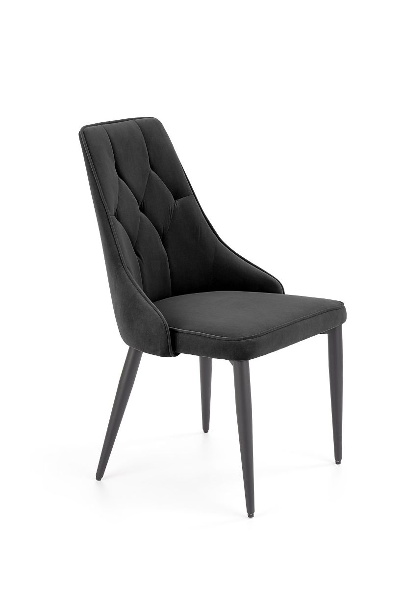 Sedák a opěradlo jsou čalouněny příjemnou sametovou látkou (velvet) v šedém odstínu a ozvláštněny dekorativním prošíváním. Stabilitu zajišťují čtyři kovové nohy z práškované oceli v černém provedení.