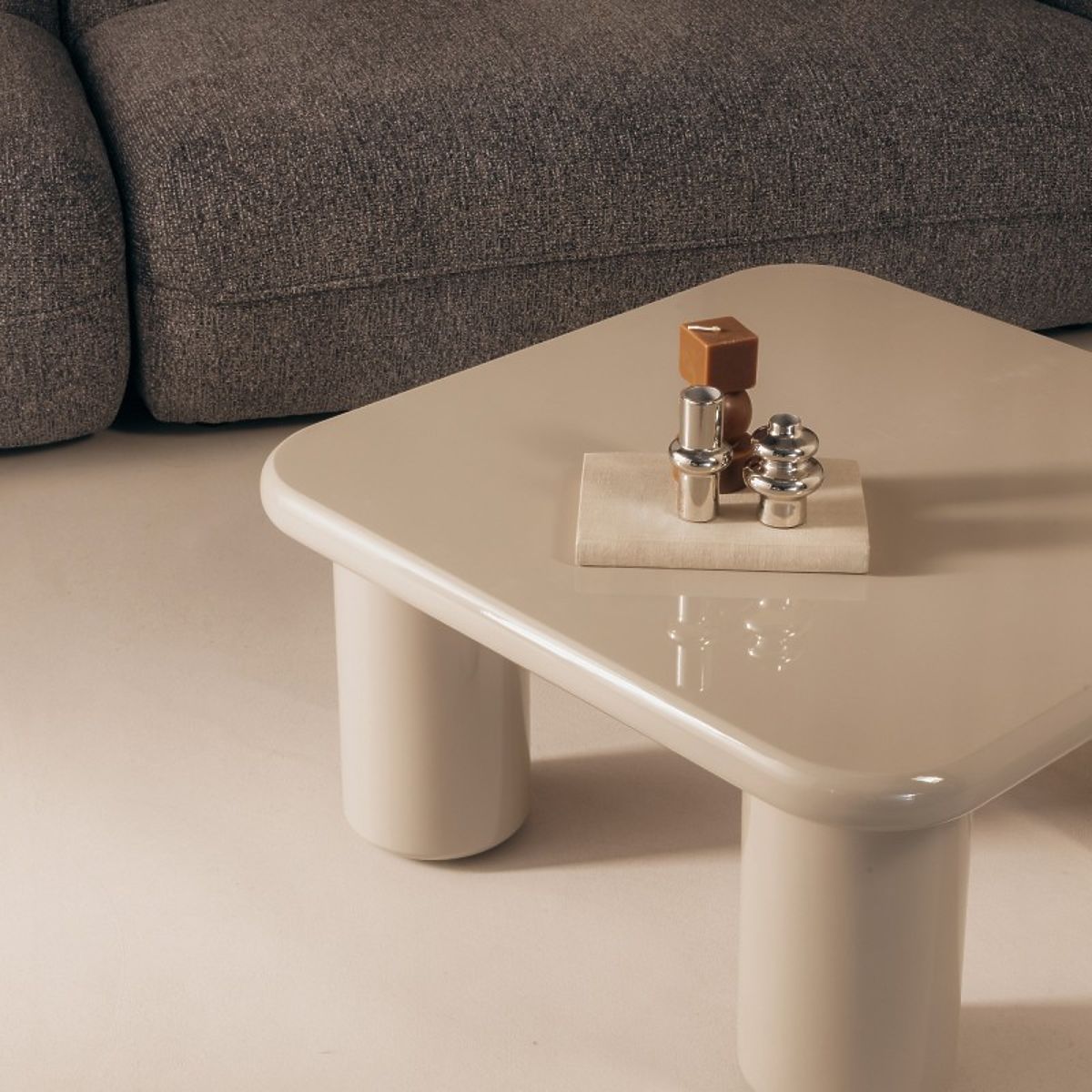 Tmavě béžový konferenční stolek s lesklým povrchem a zaoblenými hranami. .. více