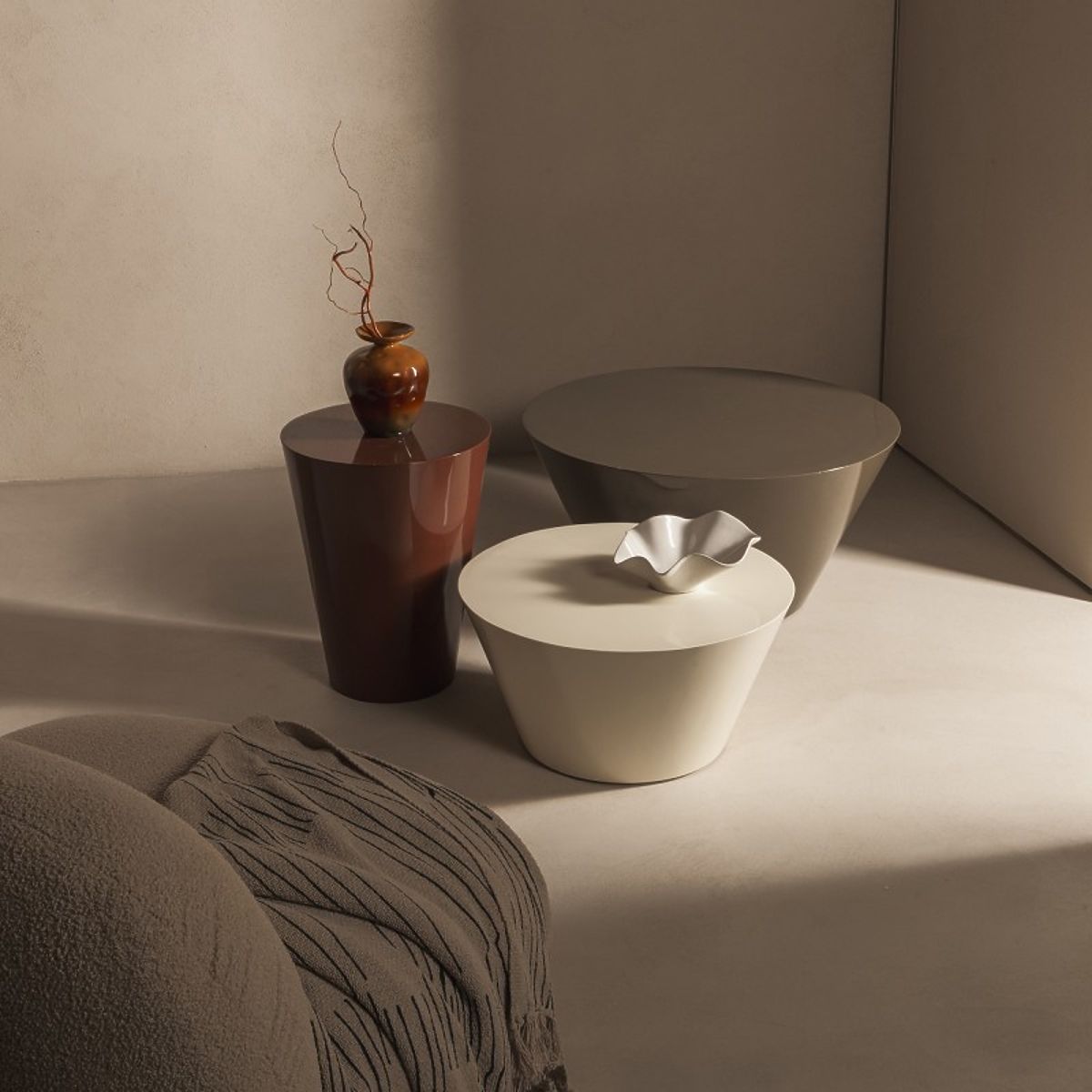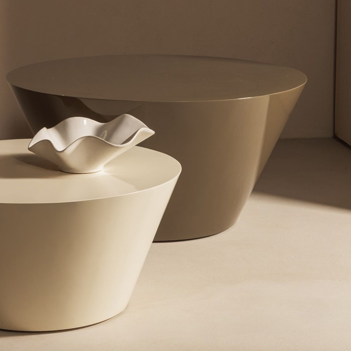 Krémově bílý stolek Eclipso s lesklým povrchem a kulatou deskou Ø60 cm. .. více