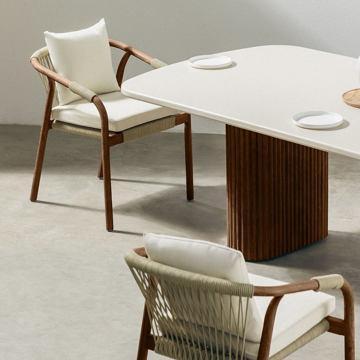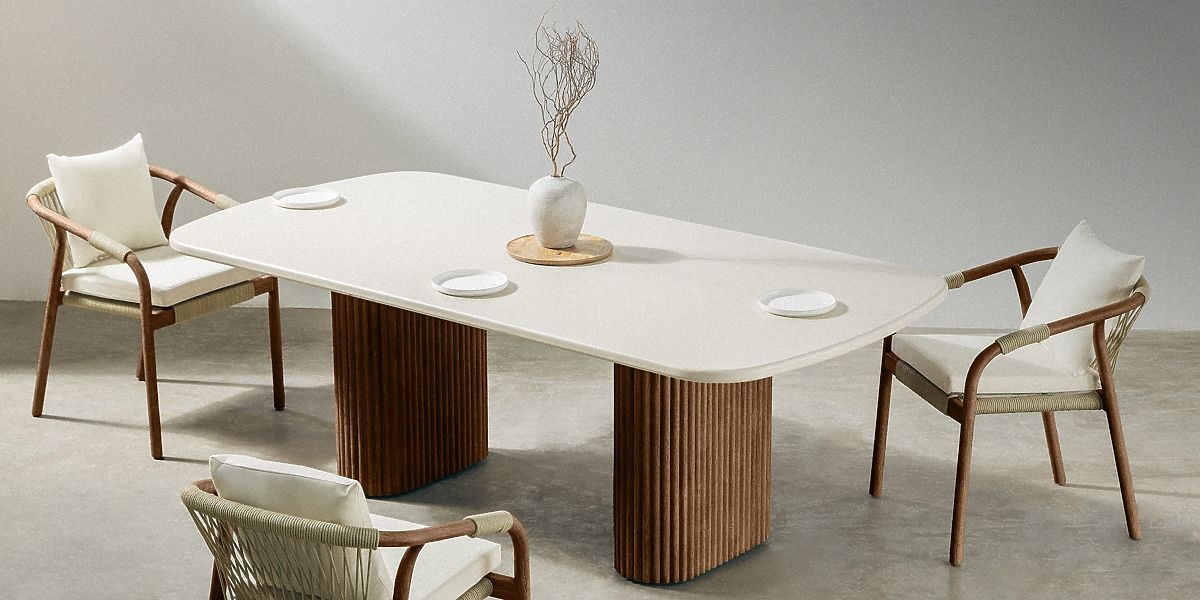 Ústředním prvkem setu je stůl se světle béžovou deskou, vyrobenou z inovativního materiálu Superstone – kompozitu, který dokonale imituje přírodní kámen, ale je mnohem odolnější vůči povětrnostním vlivům a UV záření. Jeho jemně zaoblené hrany dodávají lehkost, zatímco masivní lamelové nohy z akáciového dřeva podtrhují eleganci a dodávají teplý, přírodní charakter.