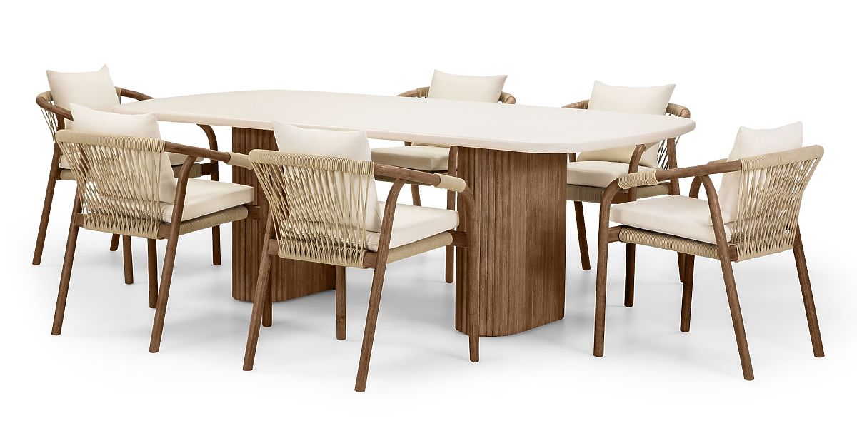 Součástí setu je šest stylových židlí, jejichž zaoblený rám z akáciového dřeva zaručuje stabilitu a trvanlivost. Pletená opěradla a sedáky, vyrobené z odolného provázku, nejen přitahují pohledy, ale také zajišťují vynikající cirkulaci vzduchu. Celek doplňují pohodlné polštáře, které zvou k relaxaci na čerstvém vzduchu. Použitá tkanina má hydrofobní vlastnosti, avšak pro zachování její trvanlivosti doporučujeme skladování na chráněném místě během deště.