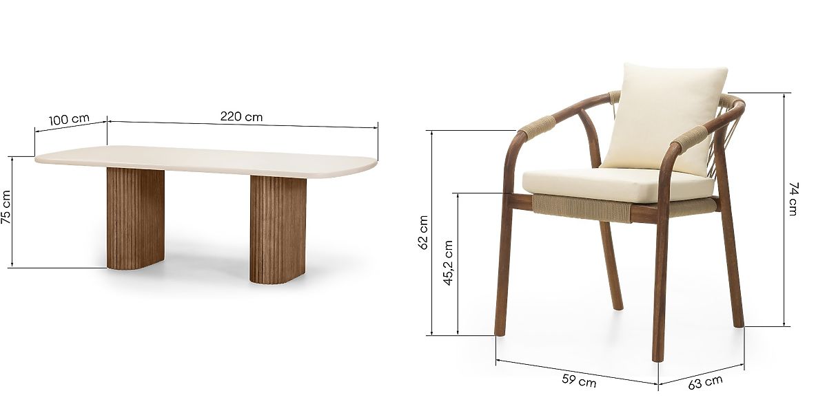Centrálním prvkem setu je stůl se světle béžovou deskou, vyrobenou z inovativního materiálu Superstone – kompozitu, který dokonale imituje přírodní kámen, ale je mnohem odolnější vůči povětrnostním vlivům a UV záření. Jeho jemně zaoblené hrany dodávají lehkost, zatímco masivní, lamelové nohy z akáciového dřeva podtrhují eleganci a dodávají teplý, přírodní charakter.