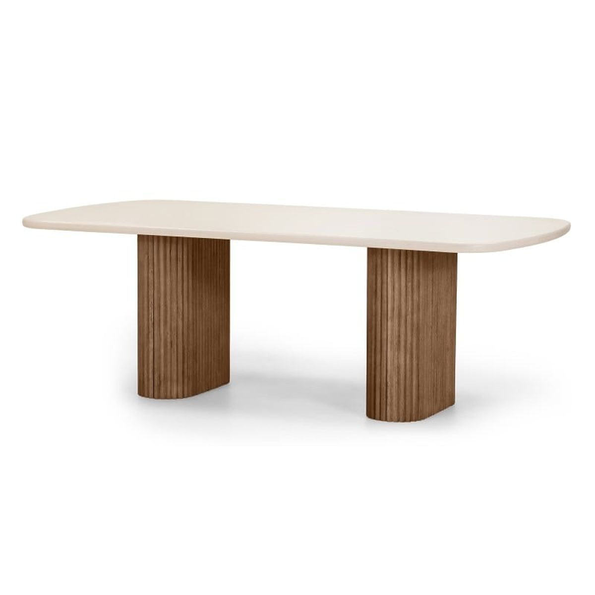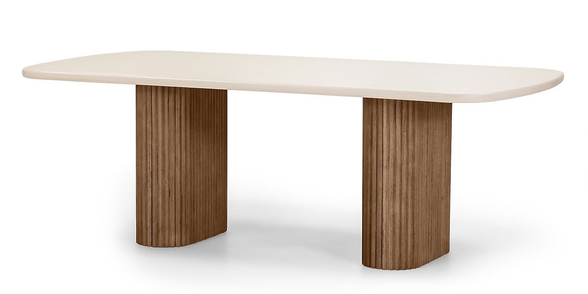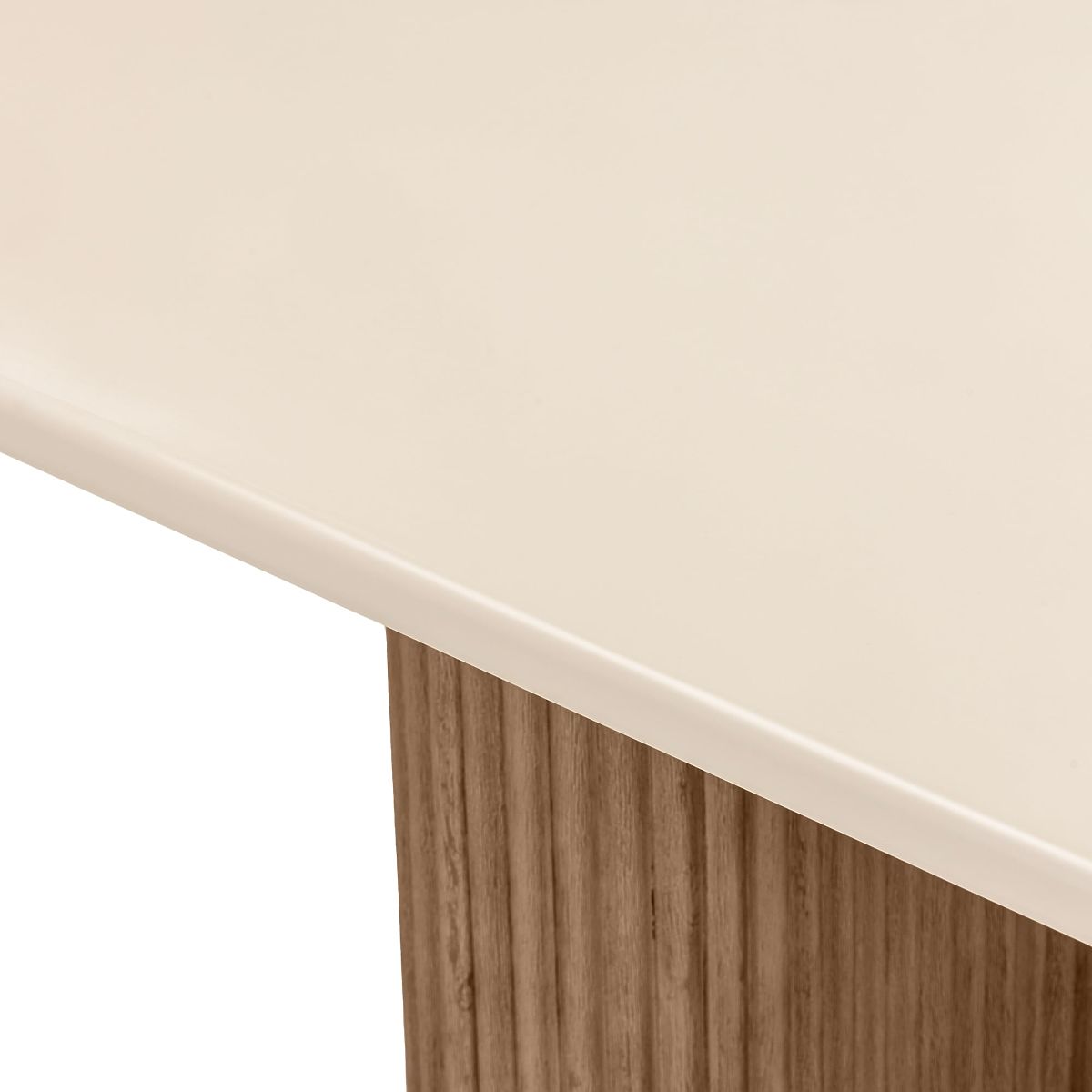 - Stůl se světle béžovou deskou a zaoblenými hranami