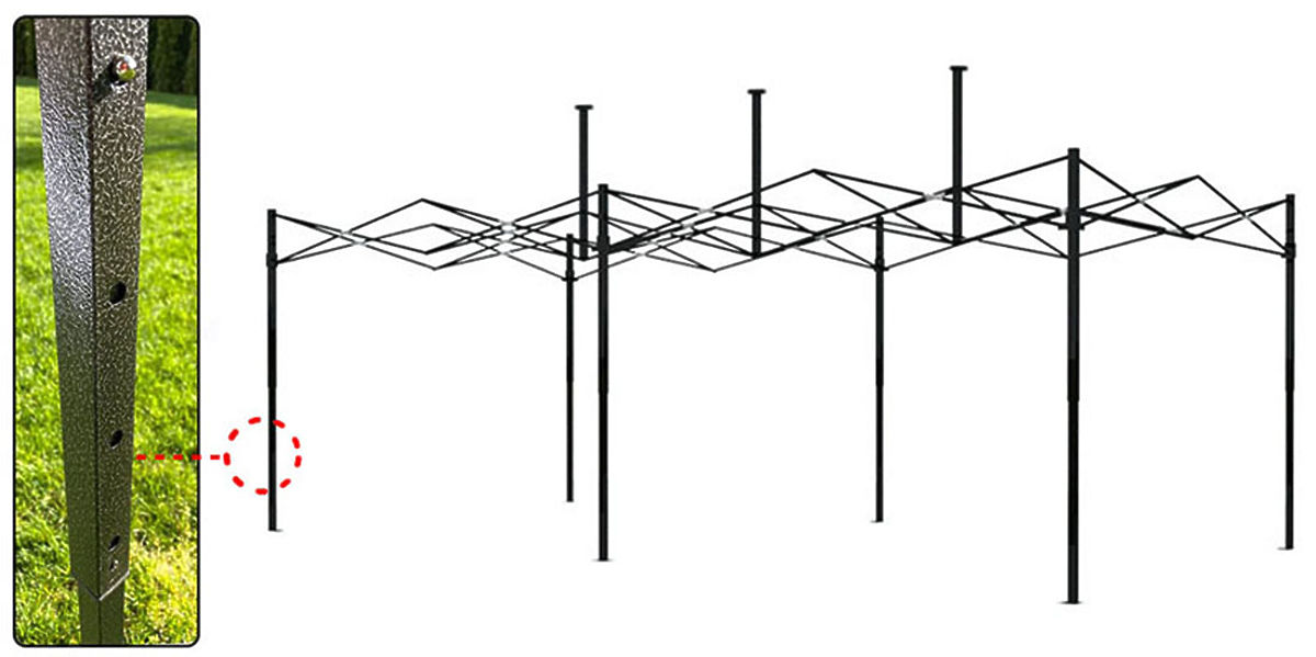 Výšku pavilonu lze přizpůsobit vašim potřebám díky 4 stupňům nastavení (280, 290, 300 a 310 cm). To znamená, že jej snadno přizpůsobíte preferované výšce. Montáž, demontáž a nastavení skládacího pavilonu je velmi snadné díky systému zámků. Stačí stisknout tlačítko, aby se konstrukce snížila. Pokud chcete pavilon zvýšit, proveďte stejnou činnost a současně zvedněte pohyblivý prvek nahoru. Díky tomuto inovativnímu řešení je přizpůsobení pavilonu vašim potřebám rychlé a pohodlné. Bez ohledu na situaci můžete snadno měnit výšku pavilonu, abyste si zajistili optimální podmínky a komfort používání.