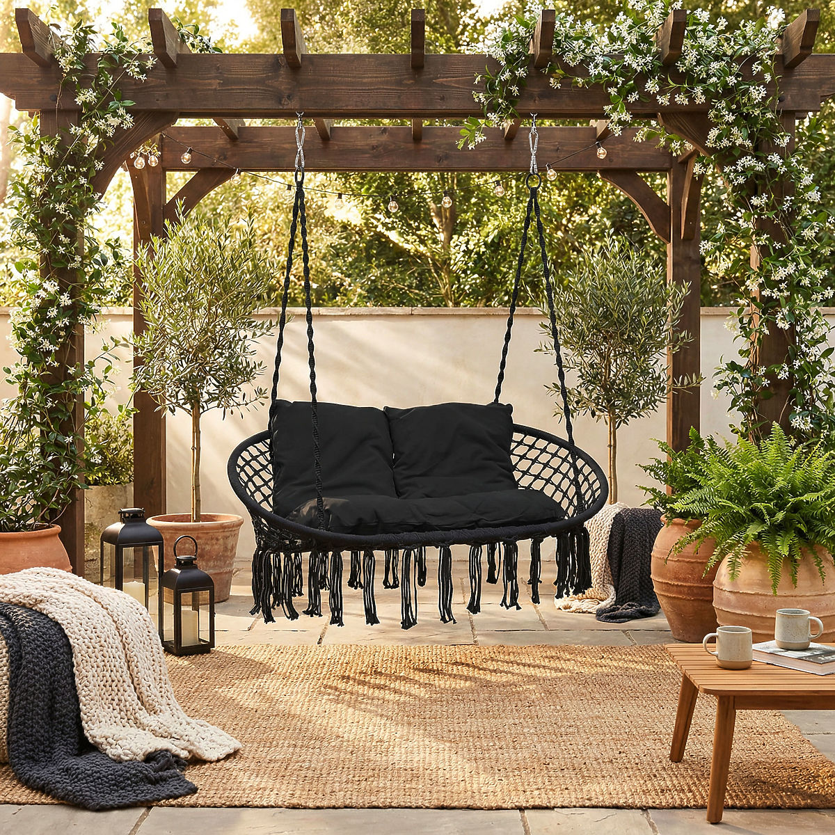 Zahradní houpačka Lagos je nejnovějším trendem v interiérovém designu. Ideální pro odpočinek ve dvou, má nosnost až 300 kg. Ocelový rám je pokryt krásnými pletenými vzory ve stylu boho. Lana držící pohodlné sedadlo jsou zakončena kovovými kroužky, což výrazně usnadňuje jedno- nebo dvoubodovou montáž houpačky. Měkké polštáře přiložené k sadě tvoří oku lahodící kompozici a výrazně zvyšují komfort používání.
