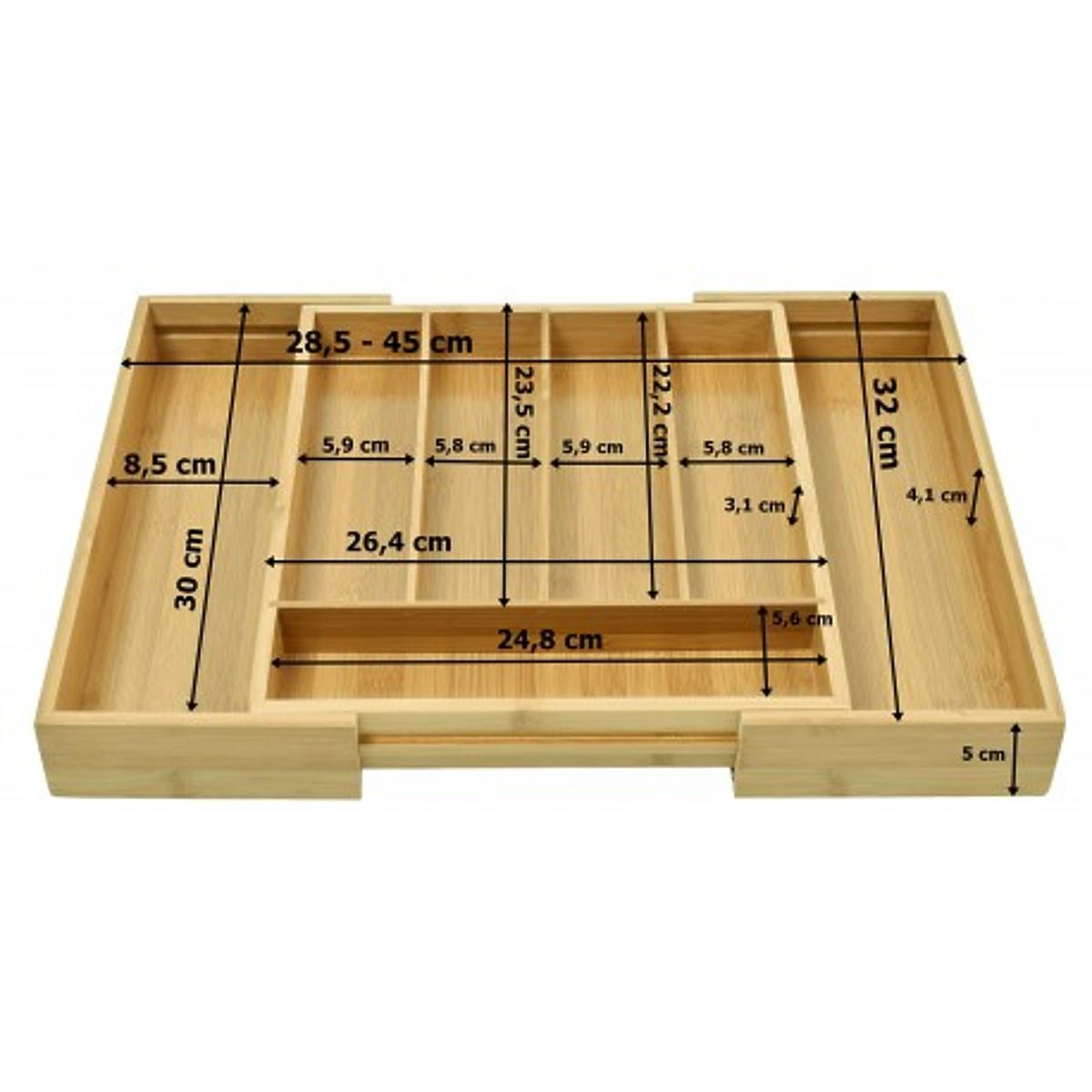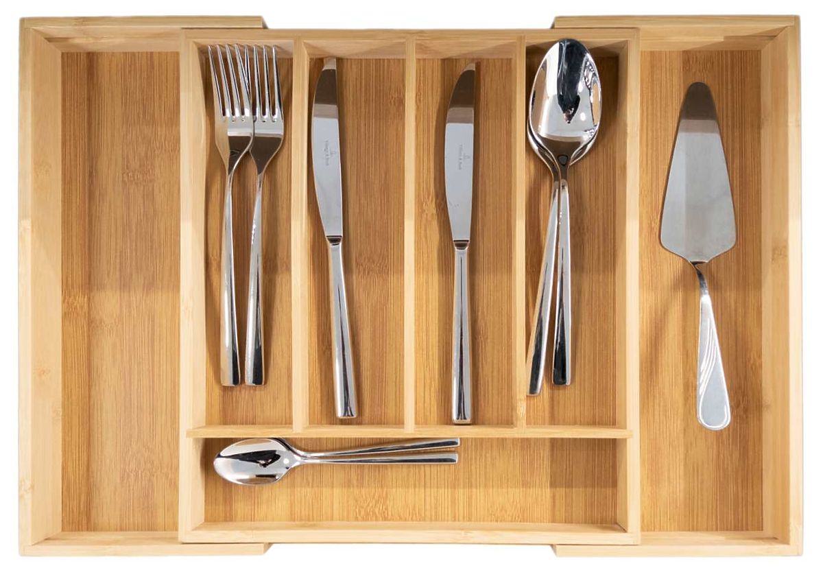 Praktický organizér na příbory vyrobený z přírodního bambusu. Bambusový organizér je velmi prostorný. Má až 7 praktických přihrádek, pět na příbory a dvě další na nože a větší kuchyňské náčiní. Bambusový organizér je rozkládací, boční přihrádky lze v případě potřeby zasunout dovnitř a ušetřit tak cenný prostor. Díky němu bude v kuchyňských zásuvkách pořádek a čistota. Jeho kompaktní rozměry zajišťují, že se vejde do většiny standardních zásuvek.