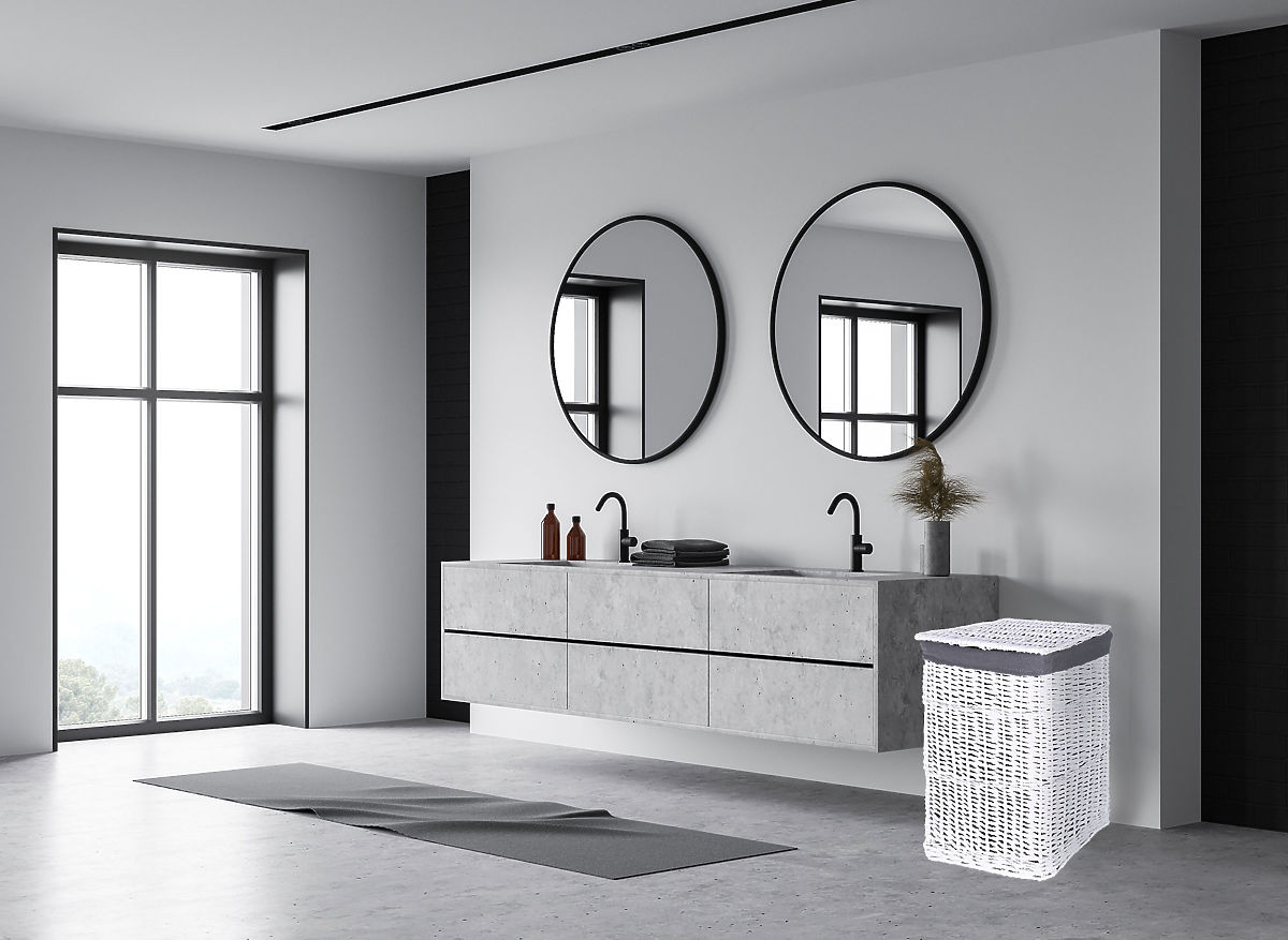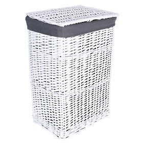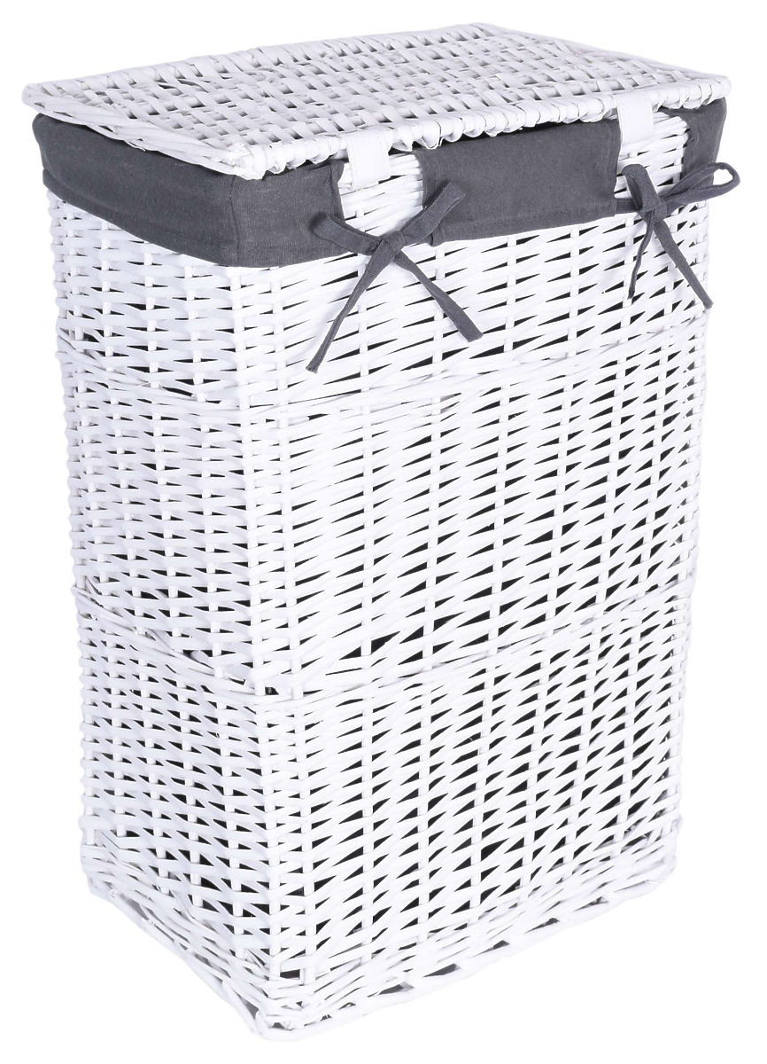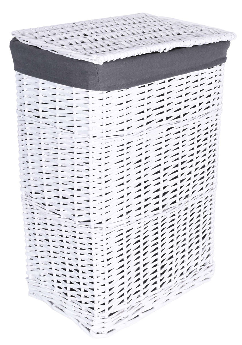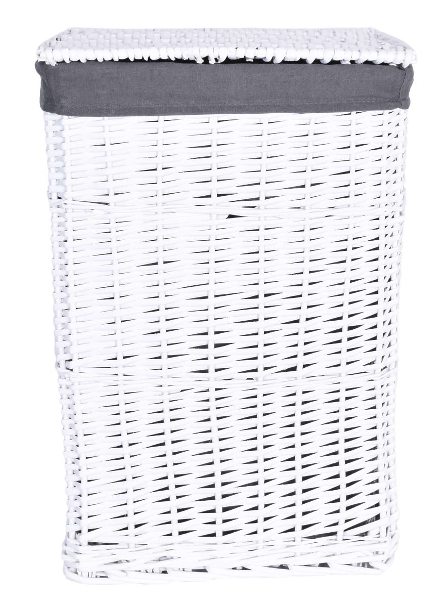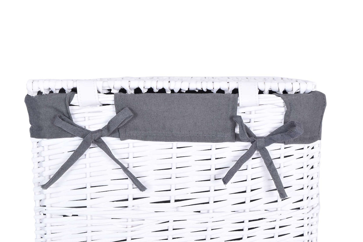 Proutěný koš ručně vyrobený z přírodního proutí, barveného křídově na bílou barvu. Vložka koše je lněná, v šedé barvě.