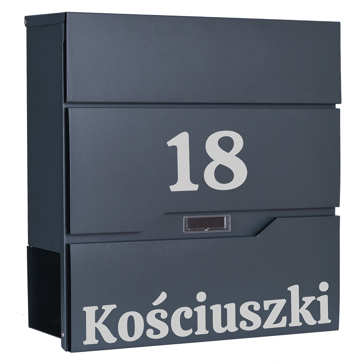 Možnost vytvoření libovolného nápisu: číslo domu, název firmy, příjmení, ulice atd. Nápis je vyroben metodou plotrování fólií Oracal, odolnou vůči povětrnostním vlivům. Fólie je ve stříbrné barvě.