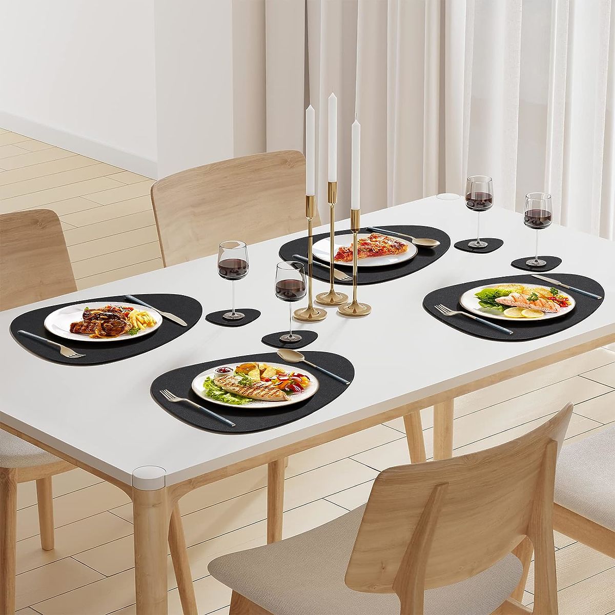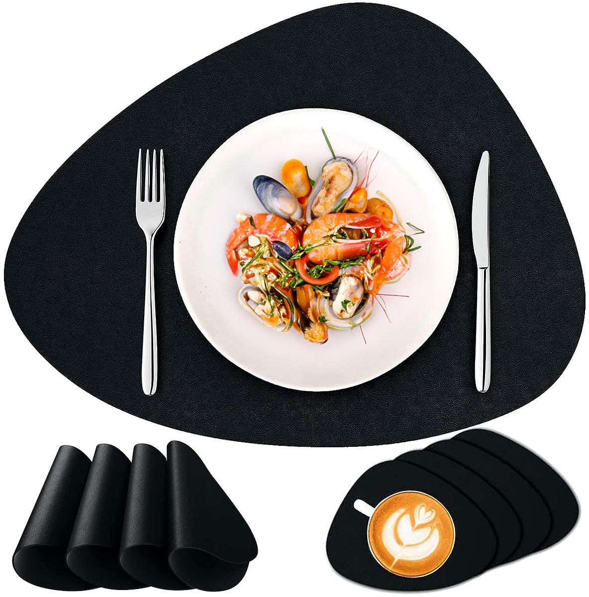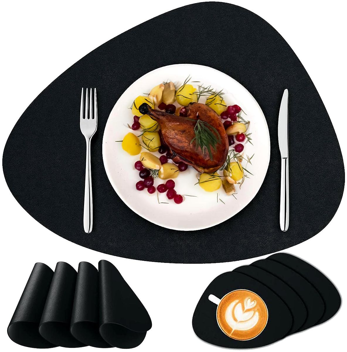 ✅ Univerzálnost: Díky své všestrannosti lze podložky z materiálu používat jak denně, tak při zvláštních příležitostech, dodávají každému jídlu a setkání výjimečný charakter. Jejich černá barva se dobře hodí k jakémukoli interiéru.
