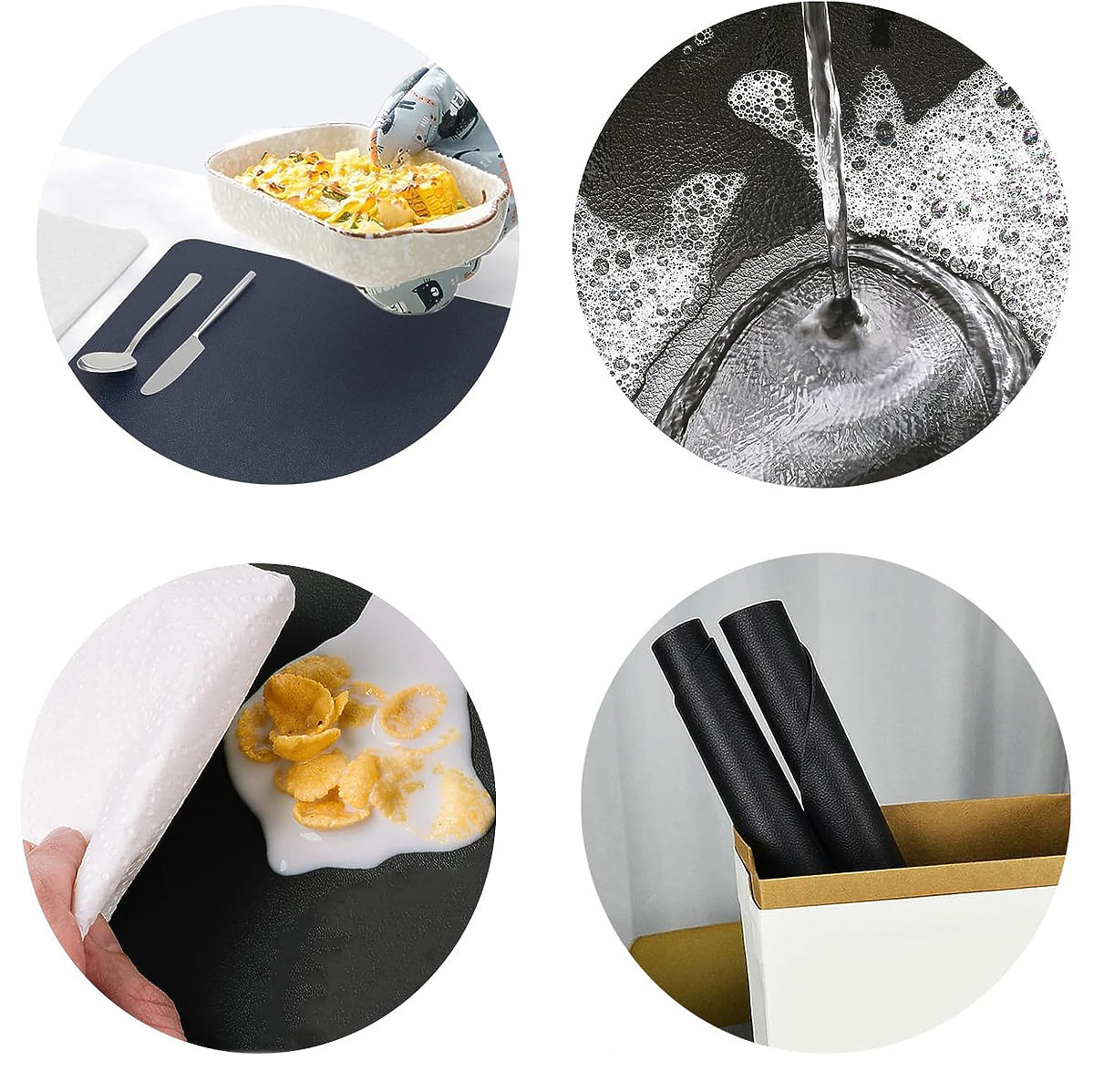 ✅ Odolnost proti vodě: Podložky z materiálu nepropouštějí vlhkost, čímž chrání povrch stolu před skvrnami a poškozením způsobeným vlhkostí.