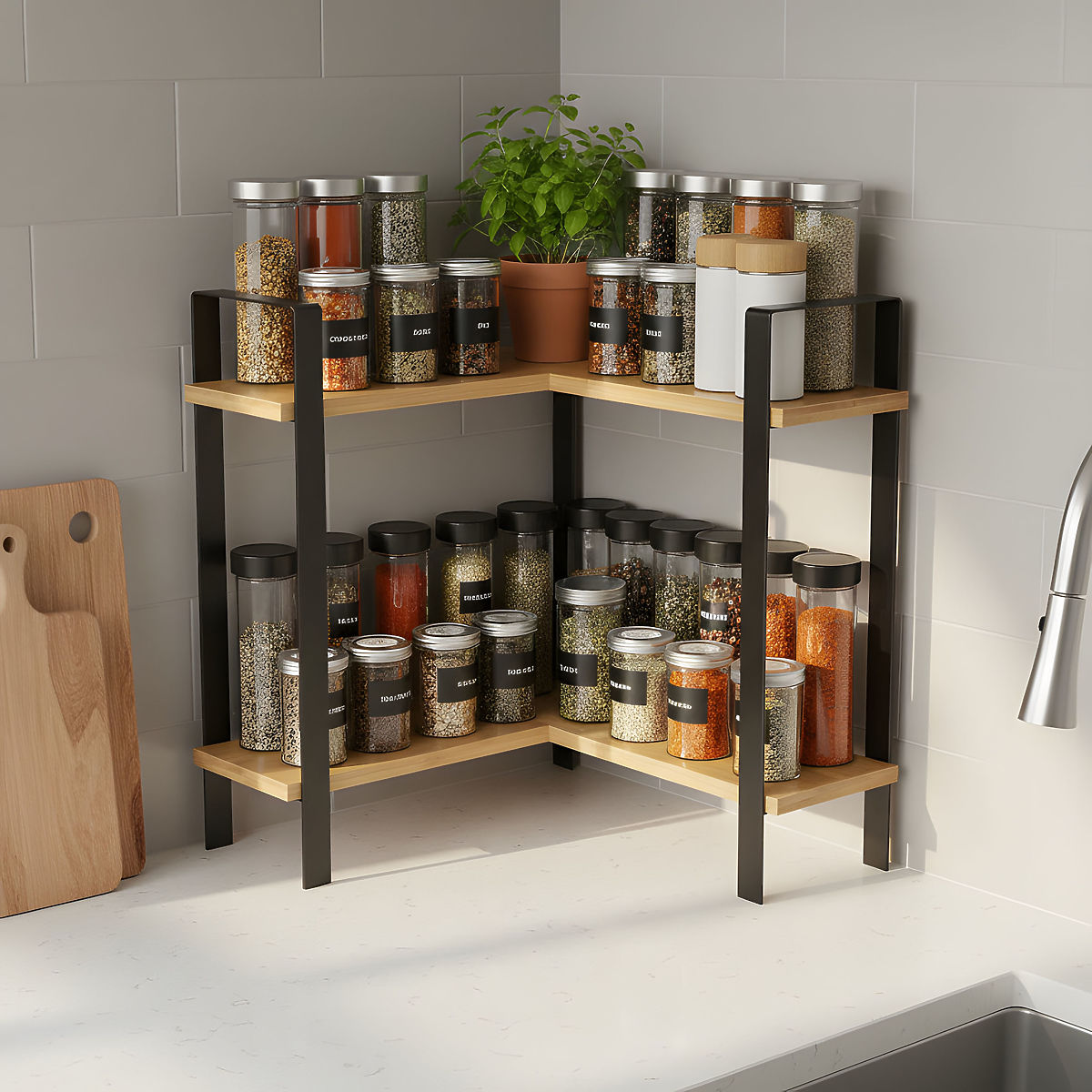 ✅ Optimální využití prostoru: Rohová konstrukce regálu Sarita umožňuje maximální využití dostupného prostoru v malých kuchyních.