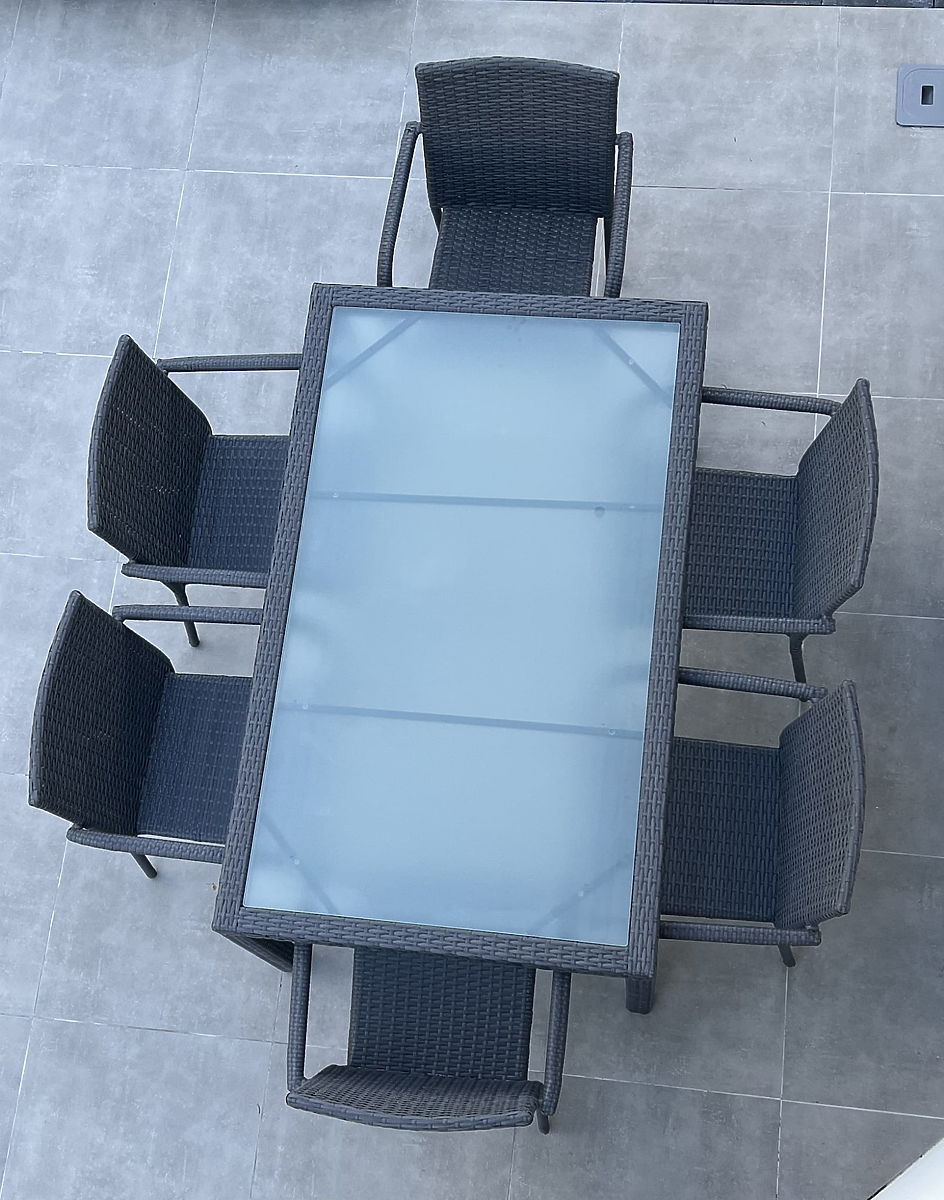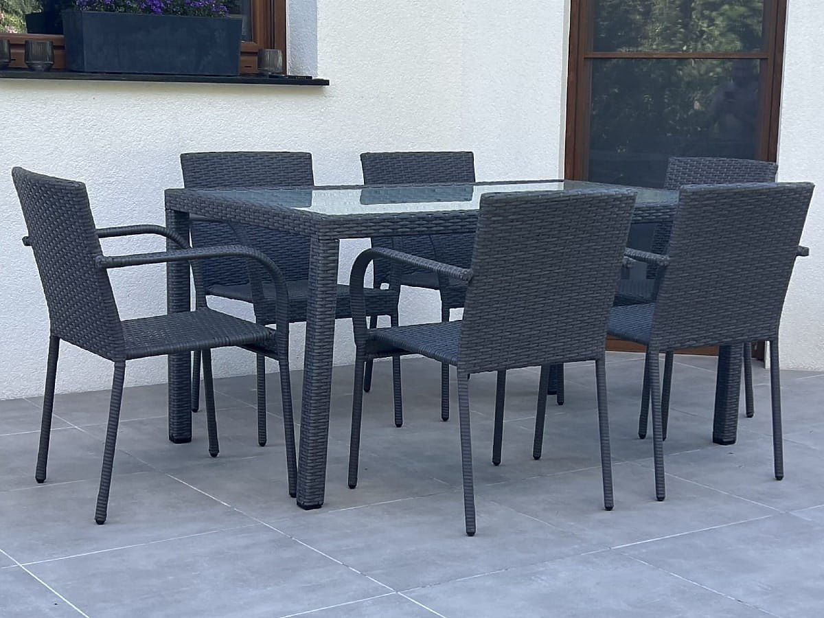 Konstrukce nábytku: stůl – hliník, židle – ocel Set obsahuje 7 dílů: 1 × stůl (s matným skleněným deskem z 5 mm bezpečnostního skla): délka 150 cm, šířka 90 cm, výška 74 cm6 × židle: šířka 56 cm, hloubka 50 cm, výška 84 cm, výška sedáku od země 44 cm, výška opěradla od sedáku 43 cm, šířka sedáku 40 cm, hloubka sedáku 43 cmSet je dodáván na 1 paletě o rozměrech 120 × 80 × 170 cm, hmotnost 60 kg. Možnost zakoupení polštářů na židle zde. Židle lze ihned po vybalení používat. Židle jsou stohovatelné (lze je vložit jedna do druhé), což značně usnadňuje skladování a šetří místo. Stůl je určen pro jednoduchou samostatnou montáž podle přiloženého návodu. Matný skleněný stůl je vložen do rámu z technoratanu. Technoratán je odolný vůči škodlivým povětrnostním vlivům, avšak pro delší zachování vzhledu doporučujeme zakoupení ochranného potahu. Potah v tmavě šedé barvě je jednocílový a má spodní šňůrku pro utažení. Všechny potahy jsou šité na zakázku, doba realizace je přibližně 14 pracovních dní.