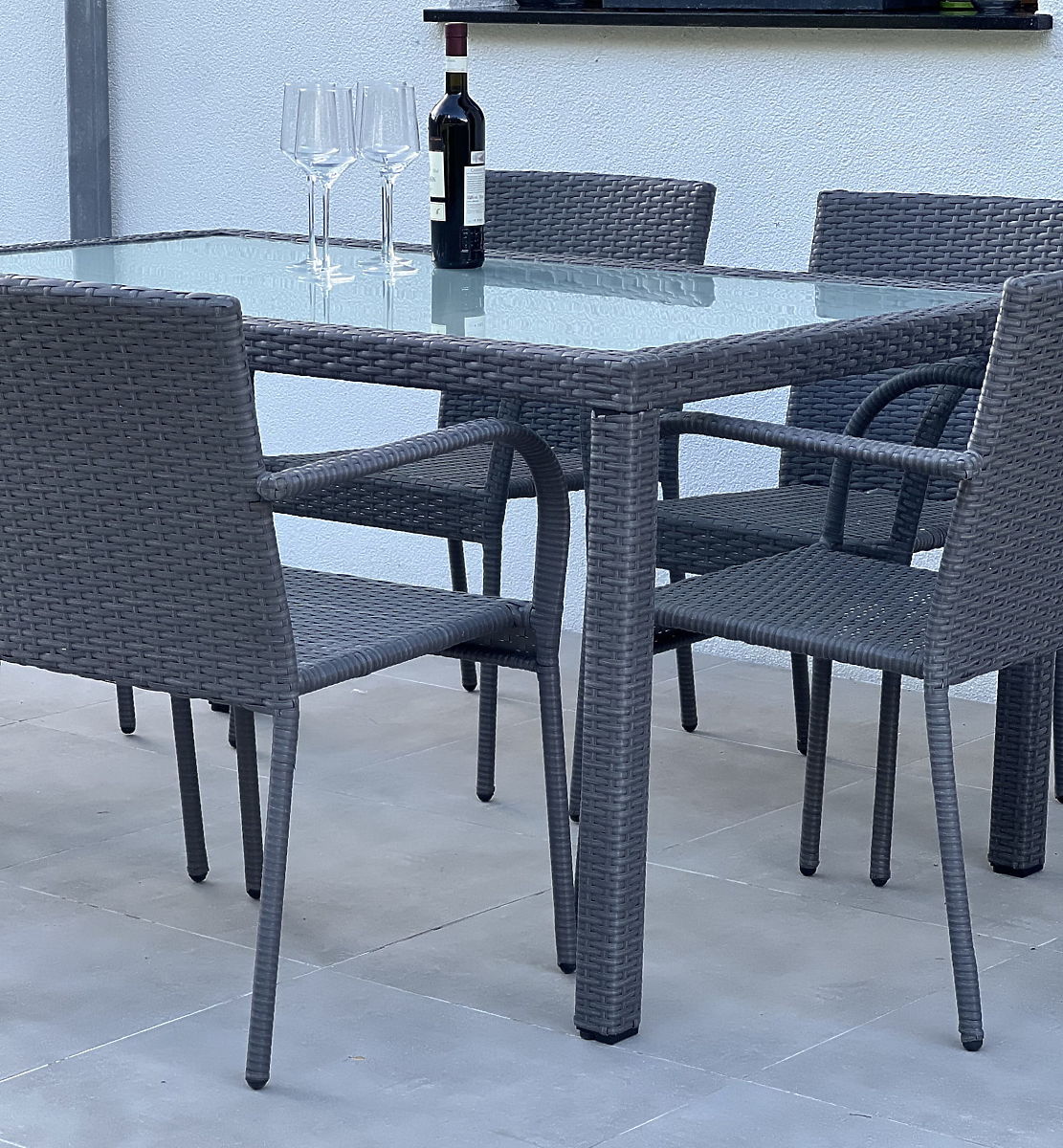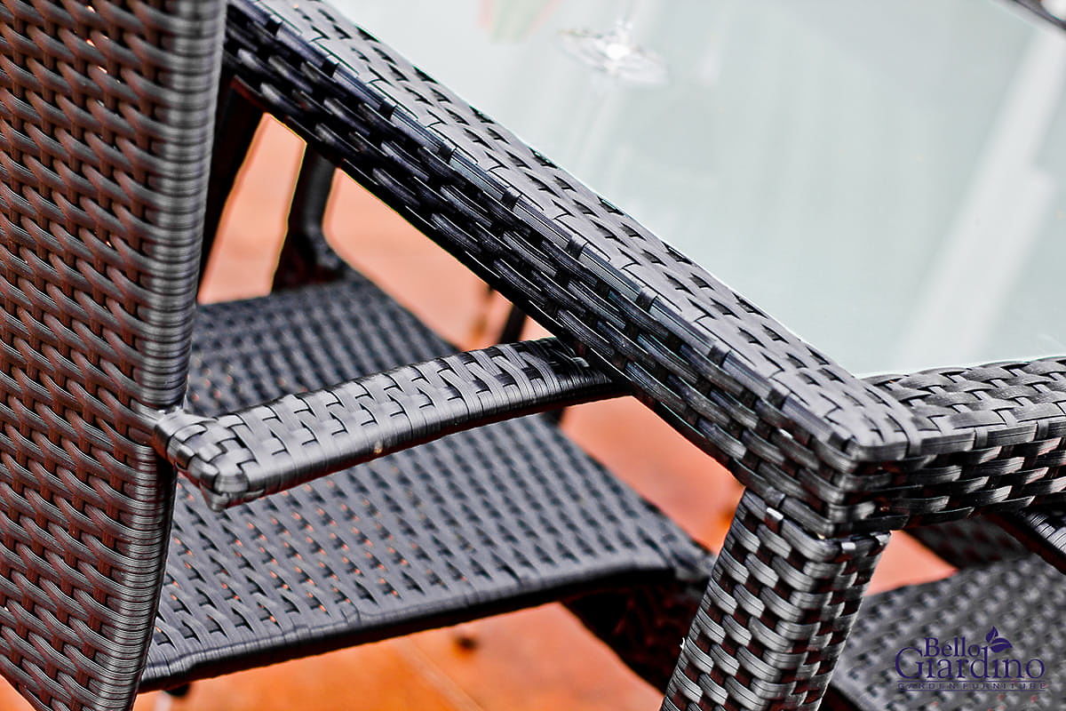 Zahradní nábytek AVVICENTE je ztělesněním elegance a funkčnosti, navržený pro ty, kteří chtějí do své zahrady či na terasu přinést nádech luxusu, aniž by museli obětovat praktičnost. Díky lehké konstrukci stolu tento set umožňuje snadné přemisťování, což umožňuje rychle měnit uspořádání venkovního prostoru podle aktuálních potřeb či příležitosti. Vyrobený z kvalitního syntetického ratanu, zahradní nábytek AVVICENTE nevyžaduje složitou údržbu a zároveň odolává nepříznivým vlivům deště, intenzivního slunečního záření i mrazu. Krásný vzhled nábytku AVVICENTE, spojený s pohodlnými židlemi a trvanlivostí materiálu, vytváří ideální podmínky pro relaxaci na čerstvém vzduchu a zajišťuje komfortní prostředí pro dlouhé letní večery. Je to vynikající volba pro ty, kteří hledají zahradní nábytek z technoratanu, který bude sloužit po mnoho let a zároveň si zachová estetiku i funkčnost. Barva setu AVVICENTE: černá – jednolitá, jemně pruhovaná struktura (stůl a židle se mírně liší strukturou pletení – viz fotografie v galerii produktu)