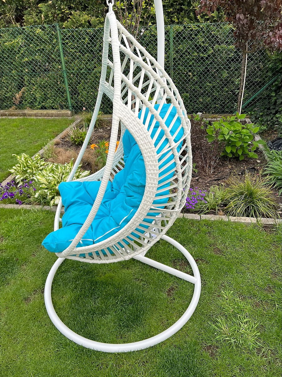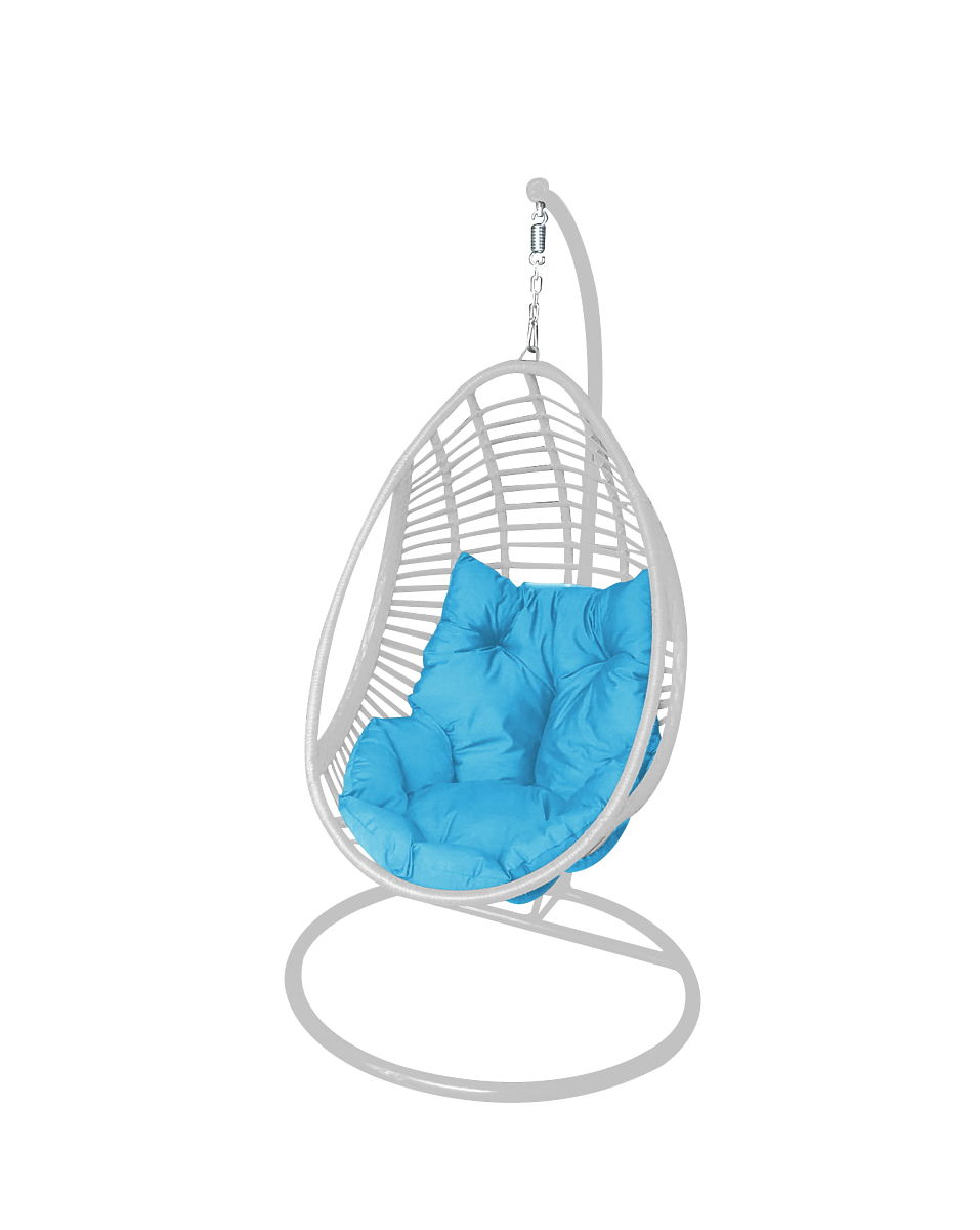Závěsné křeslo BELLISSIMO (křeslo + rám) z bílého technoratanu s modrým polštářem, potah GRA