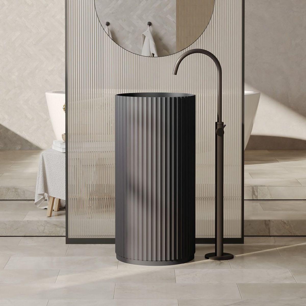 Volně stojící umyvadlo Ciriola s rýhovaným povrchem a tmavě šedou barvou. .. více