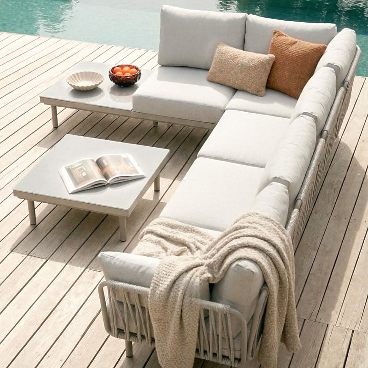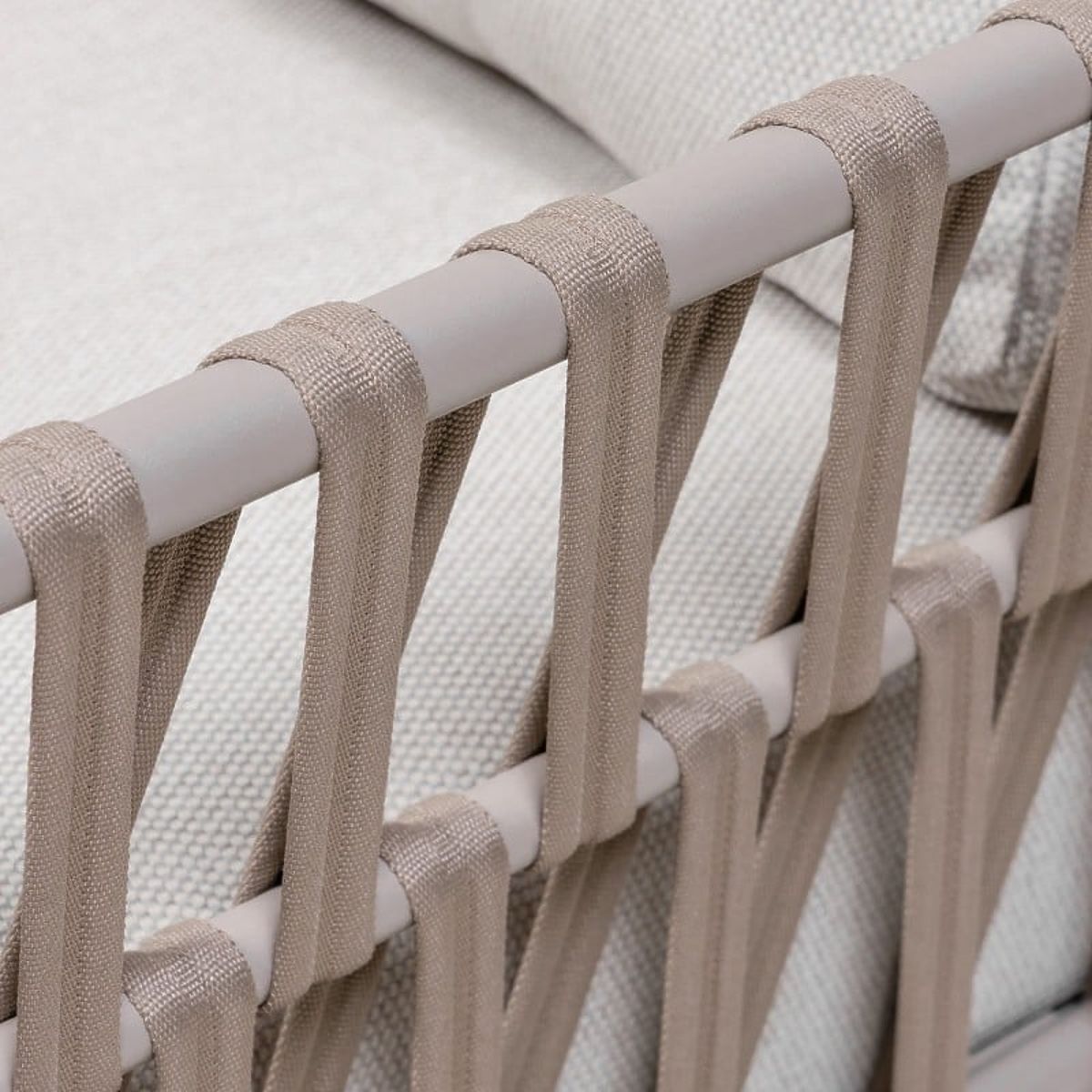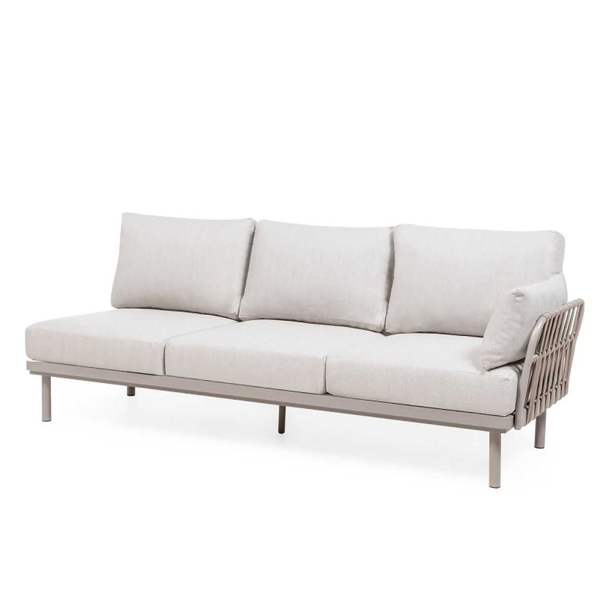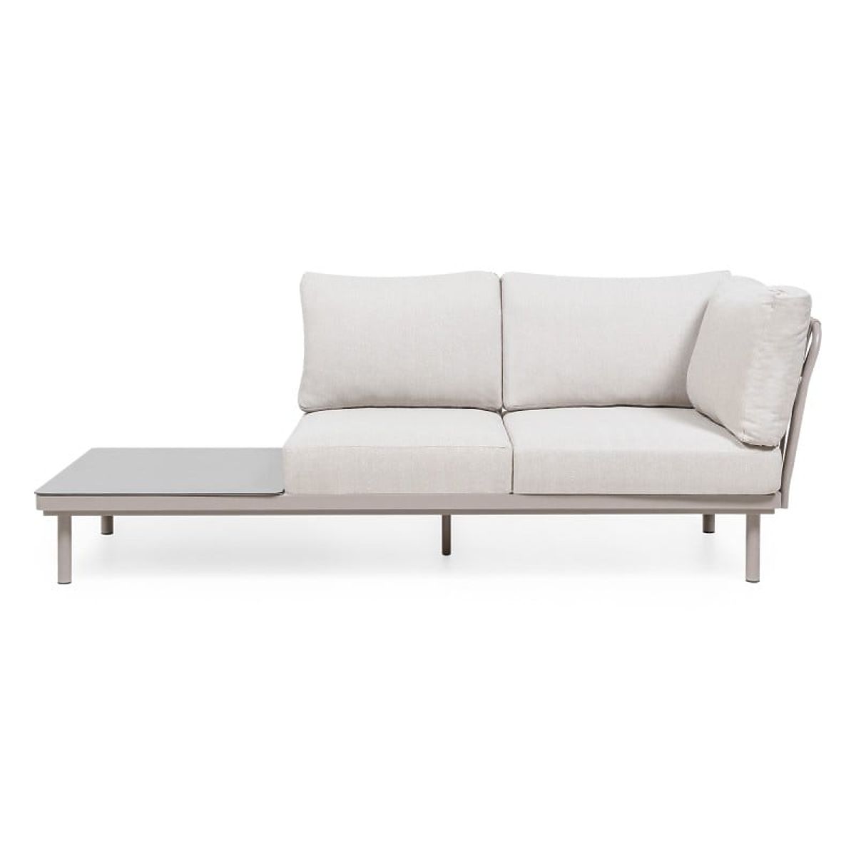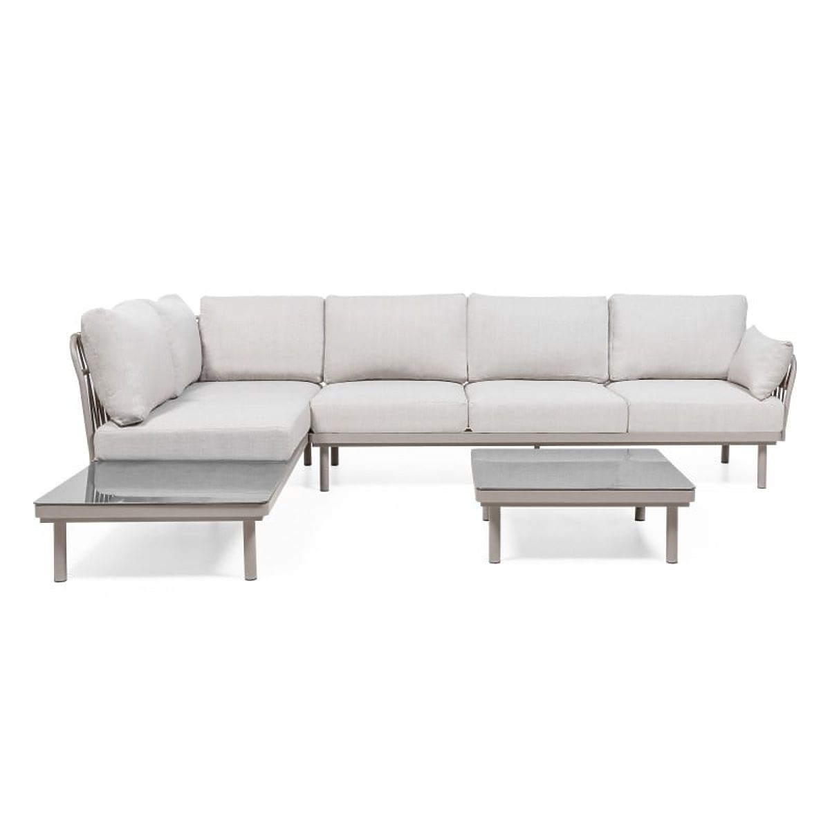 Rohová sedačka Amarello – jemná elegance v harmonické formě. Hliníková konstrukce v béžovošedém odstínu, odolné pletení a pohodlné polštáře vytvářejí sofistikovaný prostor pro odpočinek, doplněný praktickým stolkem a boční poličkou.