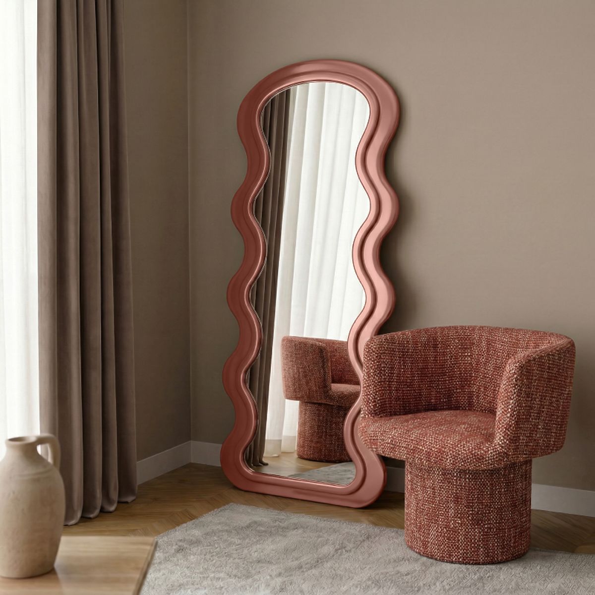 Jedním z zajímavých nápadů, který se dokonale hodí do moderních interiérů, je zrcadlo Vale v krásném, dřevěném rámu s organickým tvarem. Umístěné na stěně, je skvělým doplňkem jak ložnice, tak šatny.