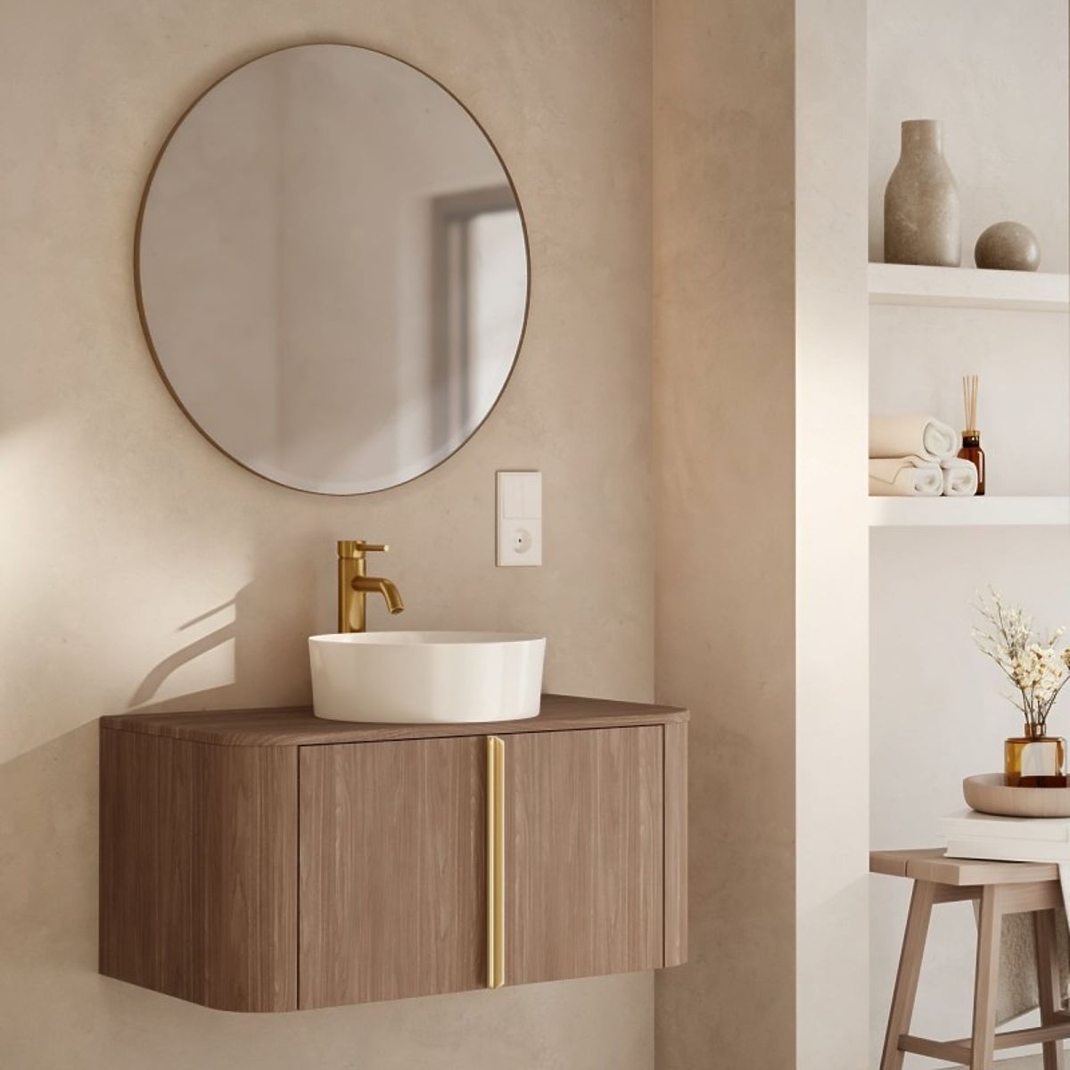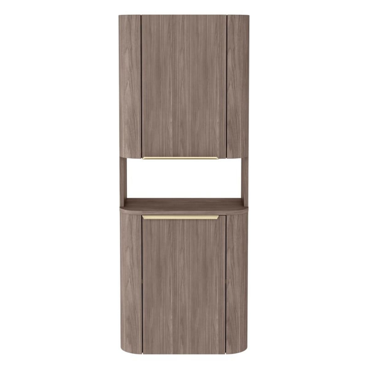 Seznamte se s koupelnovým sloupkem Bassa, který spojuje jemnou eleganci s výjimečnou funkčností. Jeho módní odstín ořechu lincoln a zaoblené tvary, obohacené o zlaté úchyty, vnesou do vaší koupelny nevšední atmosféru.