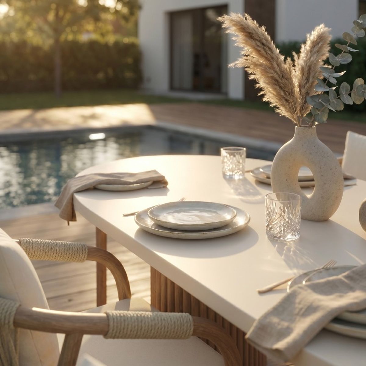 Stůl Komorebi je kombinací moderního designu a funkčnosti. Kamenná deska a dřevěné nohy zdobené lamelami vytvářejí stylový kontrast, který oživí každou zahradní plochu. Je to ideální místo pro kávu nebo oběd v elegantním, ale přirozeném stylu.