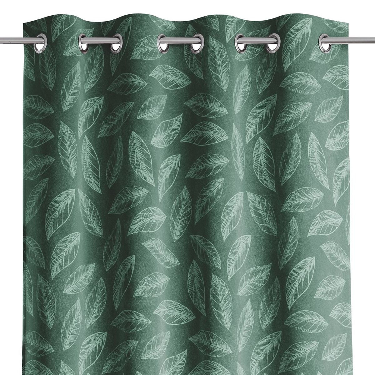 Lahvově zelený závěs s rostlinným motivem a stříbrnými kovovými kroužky. .. více