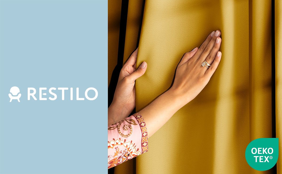 Lukafurniture.cz » Závěsy a záclony / Závěsy / RESTILO závěs BLACKOUT barva hořčicová šerpa klasický styl stříbrné průchodky materiál