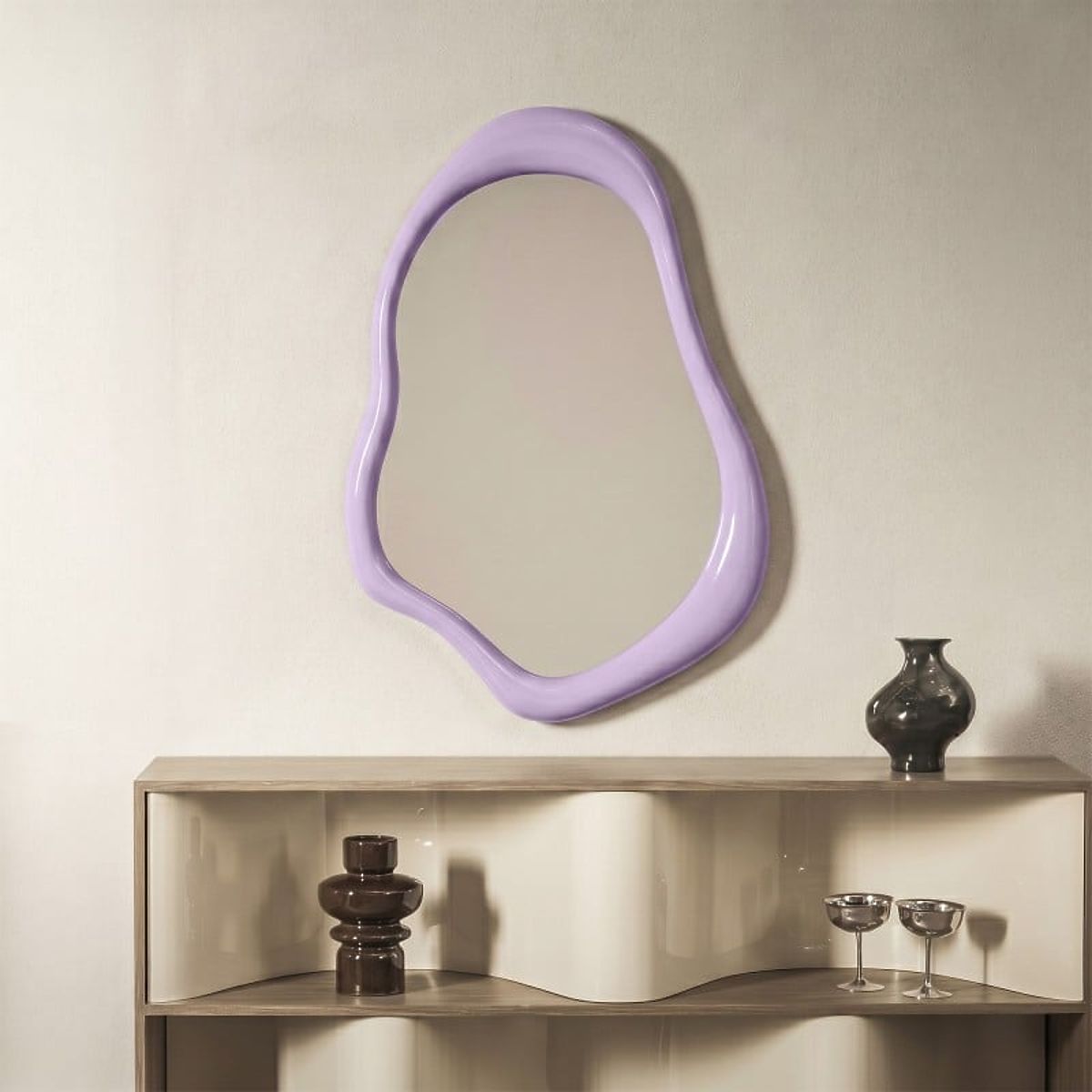 Zrcadlo Maluma je stylový dekorativní prvek, který upoutá pozornost na první pohled. Nepravidelný rám z lila MDF desky, dokončený ve vysokém lesku, dodává prostoru charakter, energii a moderní eleganci. Ideální pro interiéry, které se chtějí odlišit.