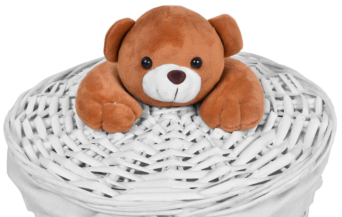Produkt je vyroben z proutí s rovnoměrným pletením, uvnitř je vyložen odolným, krémovým, lněným materiálem. Víko má nahoře příjemného na dotek, plyšového medvídka.